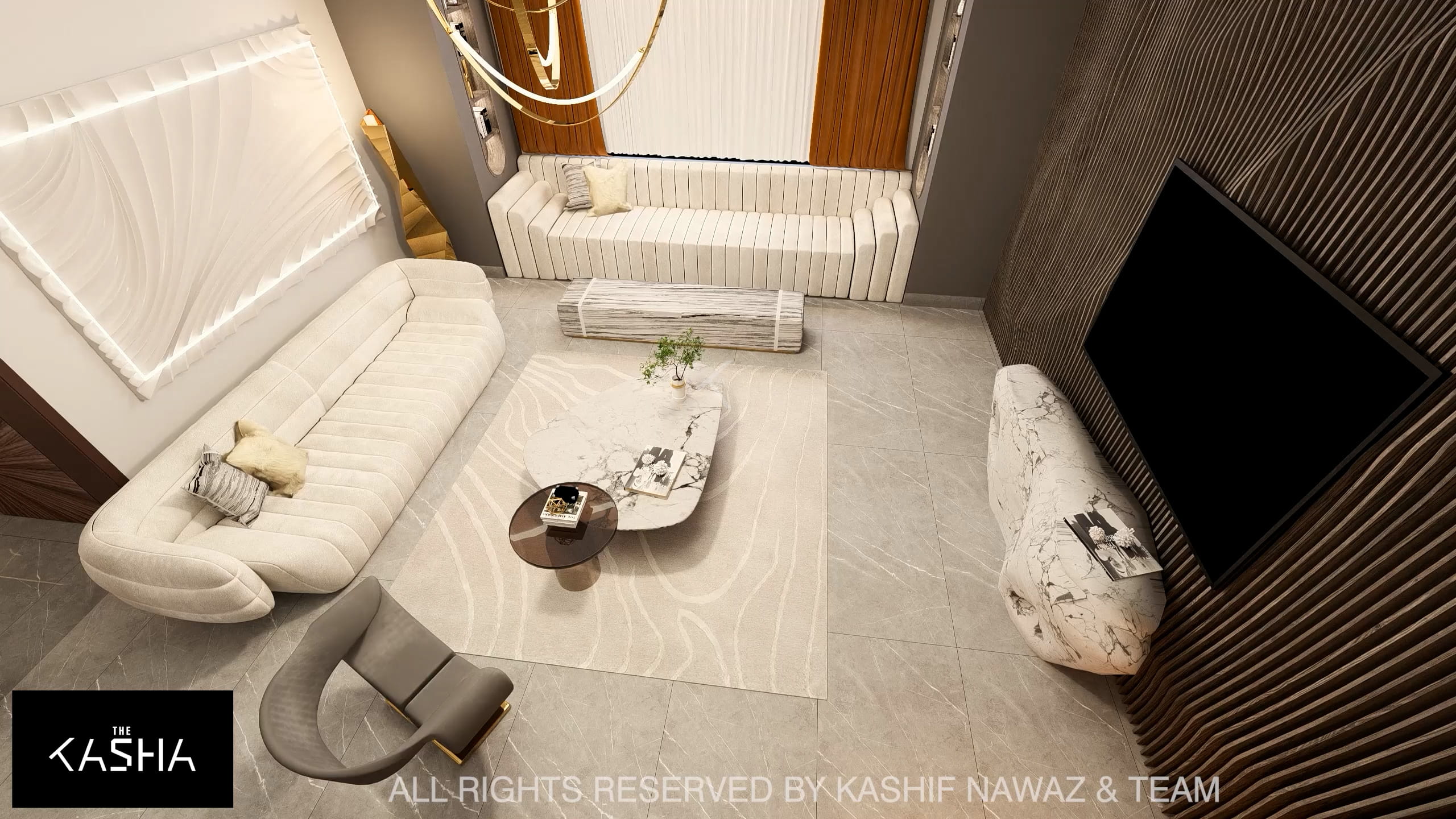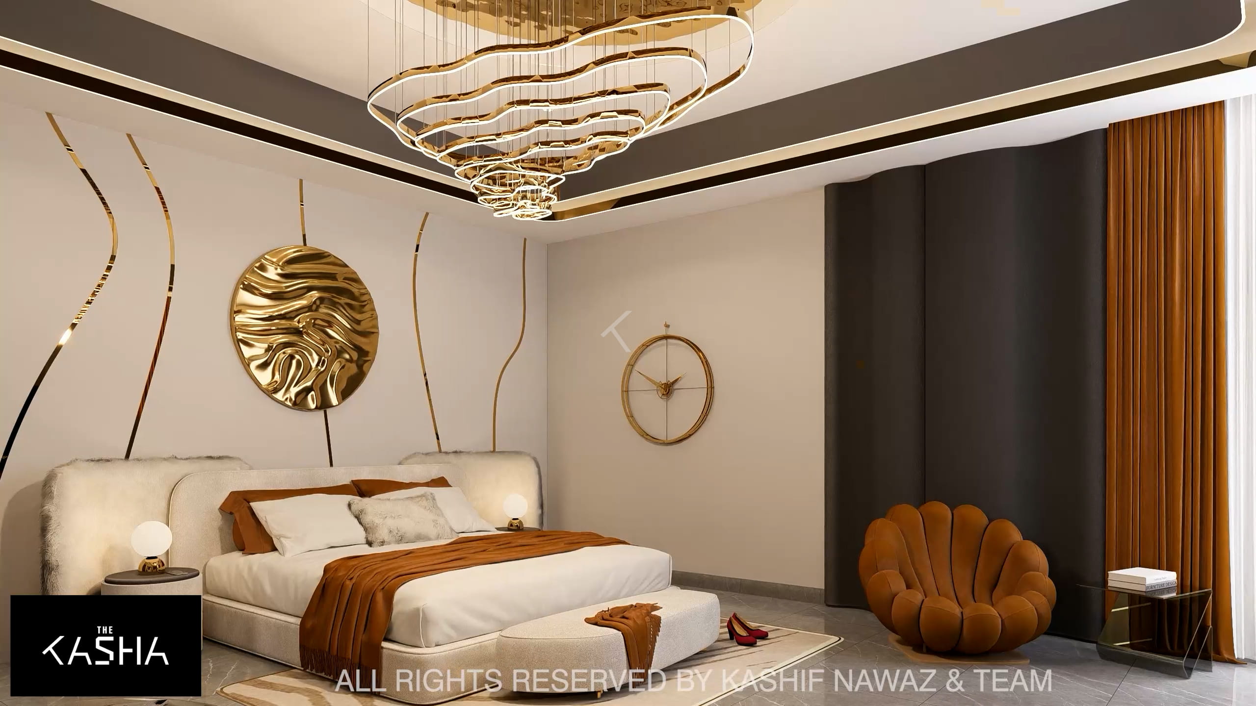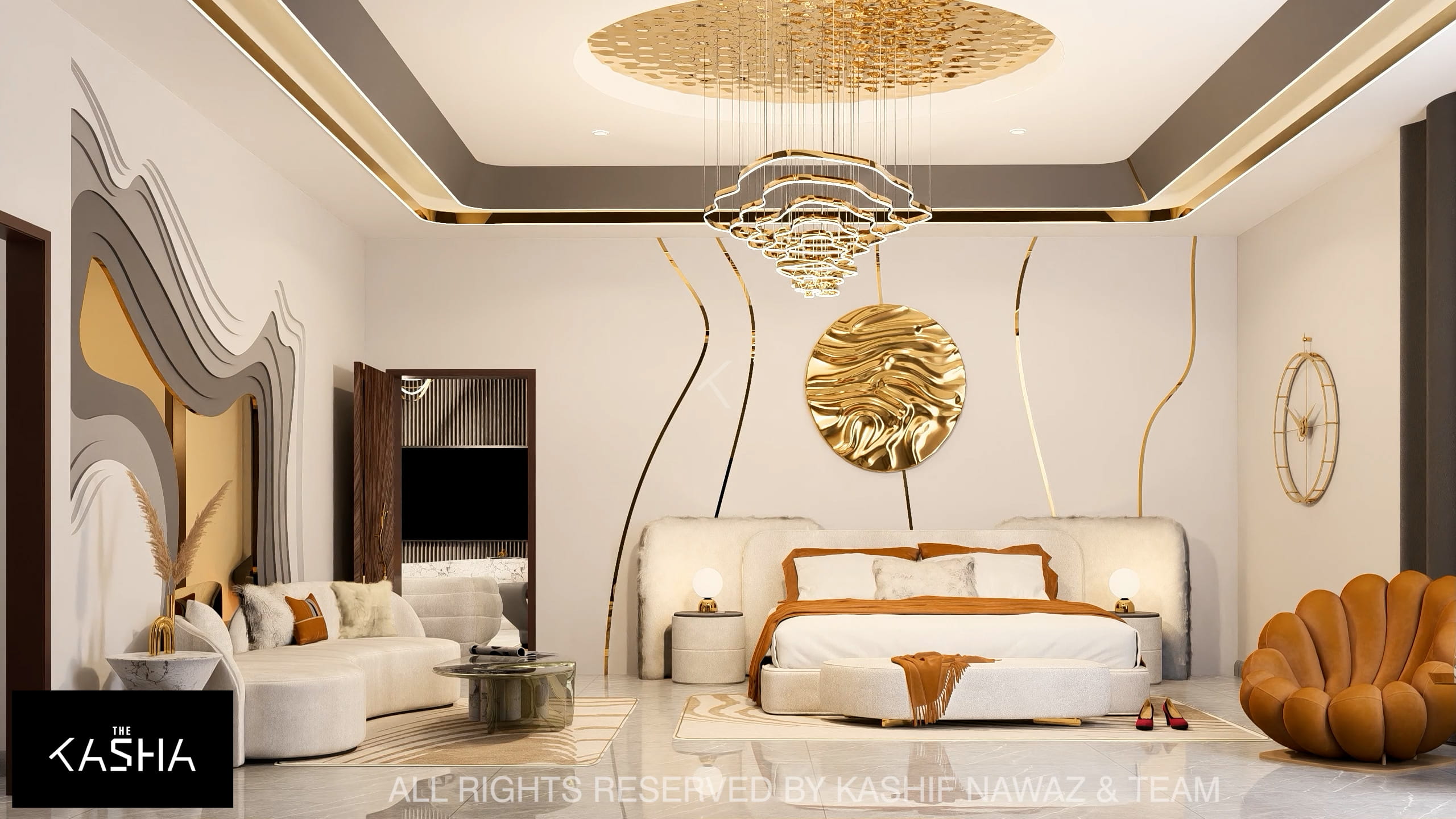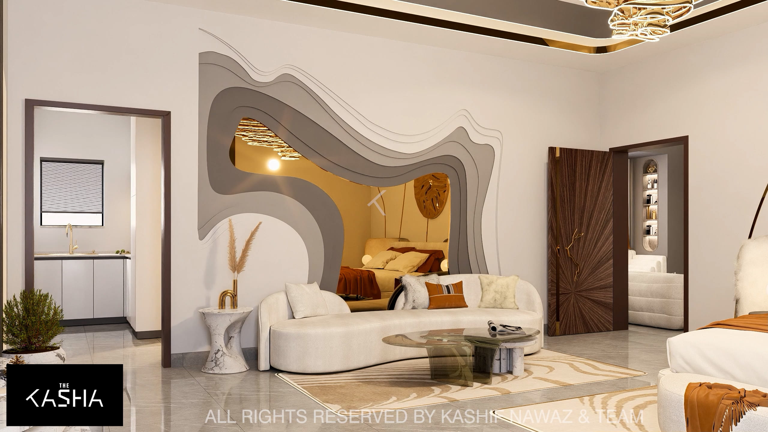 This project showcases a contemporary luxury interior with a strong emphasis on fluid forms, warm neutrals, and refined metallic accents. The design blends modern minimalism with sculptural elegance, using soft ivory, beige, and taupe tones layered with rich gold and caramel highlights. Custom statement lighting, organic wall art, and curved furniture create a sense of movement and visual harmony throughout the space. Textured fabrics, marble elements, and clean architectural lines enhance the overall sophistication, resulting in a calm, upscale environment that feels both inviting and visually striking.
