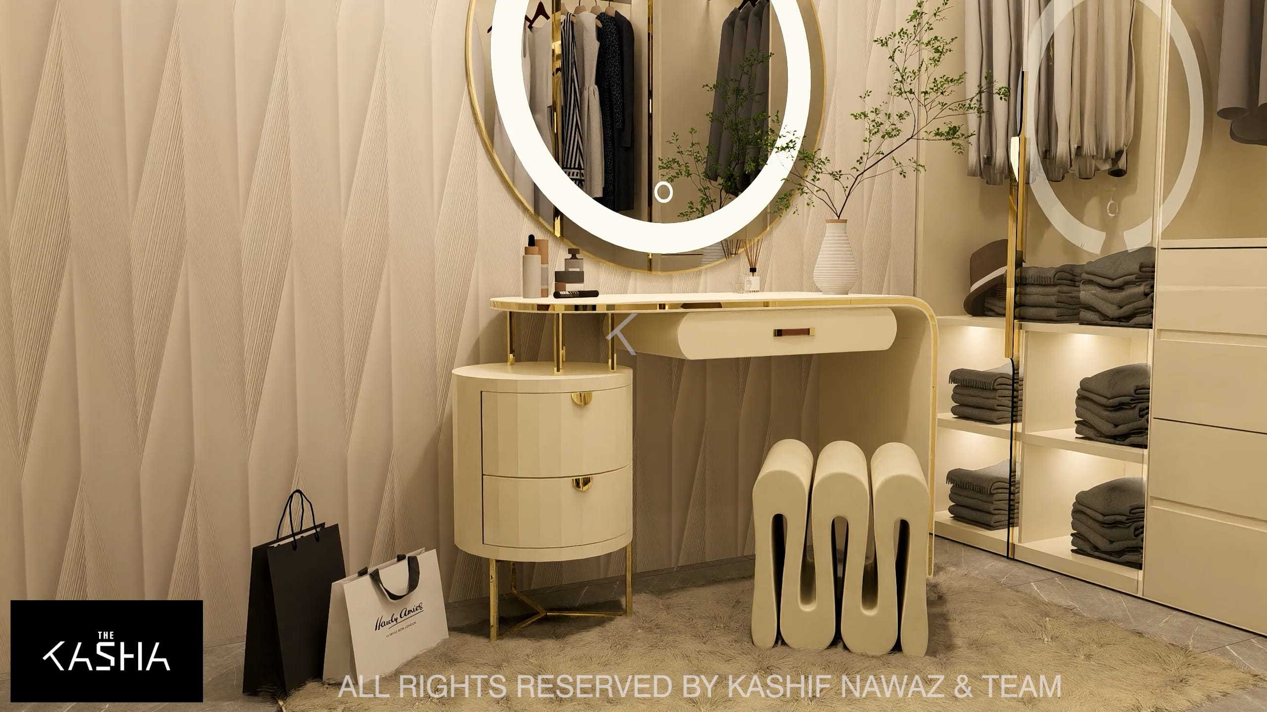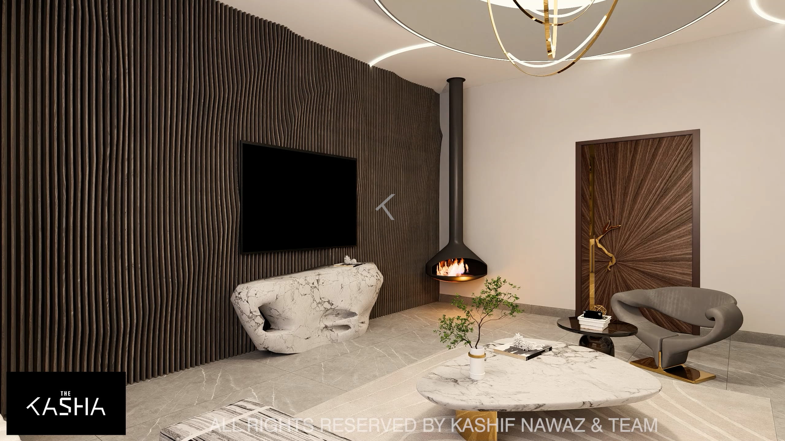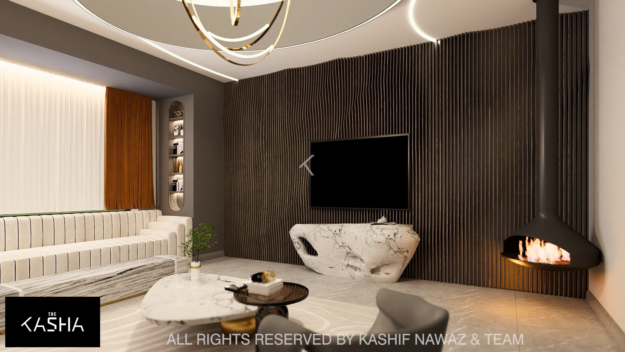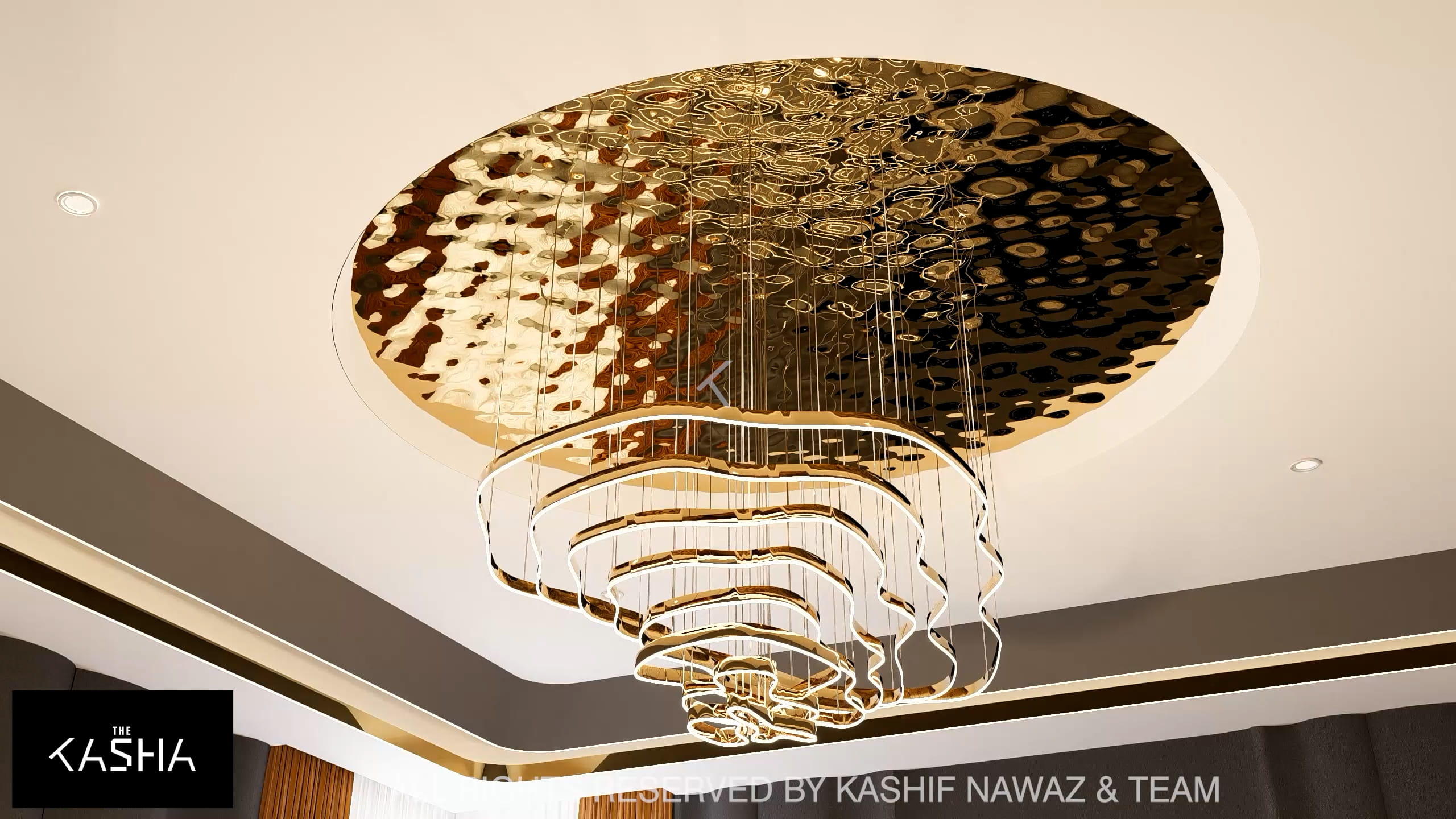 This project showcases a contemporary luxury interior with a strong emphasis on fluid forms, warm neutrals, and refined metallic accents. The design blends modern minimalism with sculptural elegance, using soft ivory, beige, and taupe tones layered with rich gold and caramel highlights. Custom statement lighting, organic wall art, and curved furniture create a sense of movement and visual harmony throughout the space. Textured fabrics, marble elements, and clean architectural lines enhance the overall sophistication, resulting in a calm, upscale environment that feels both inviting and visually striking.