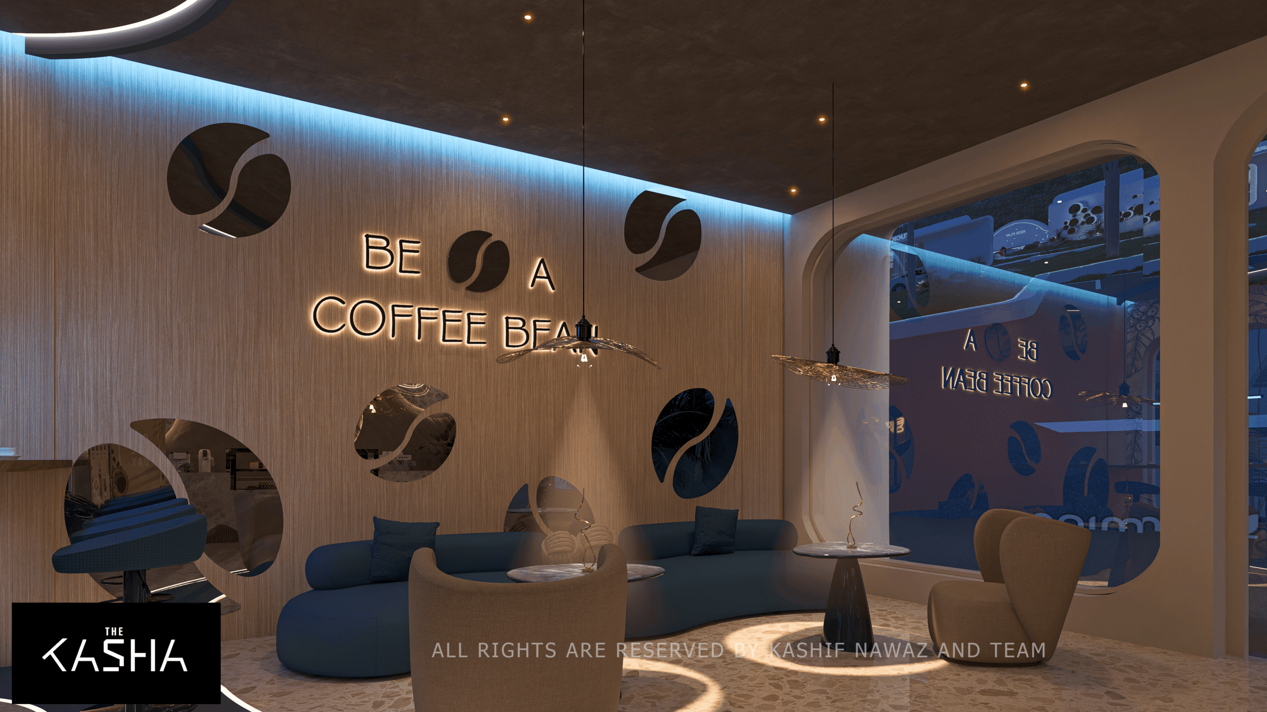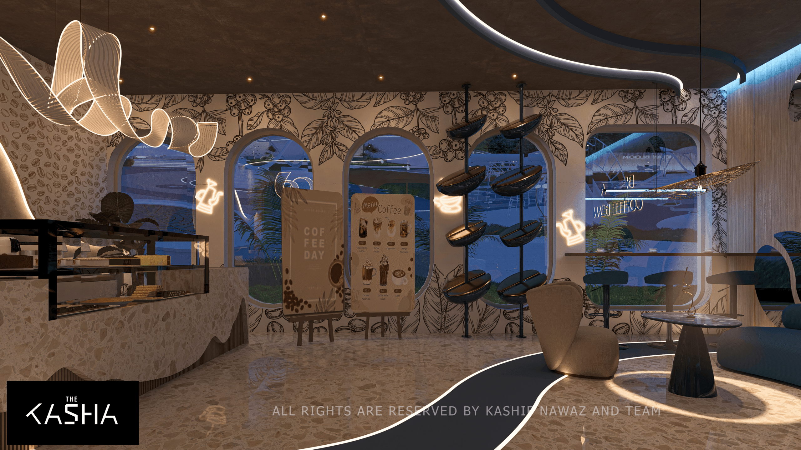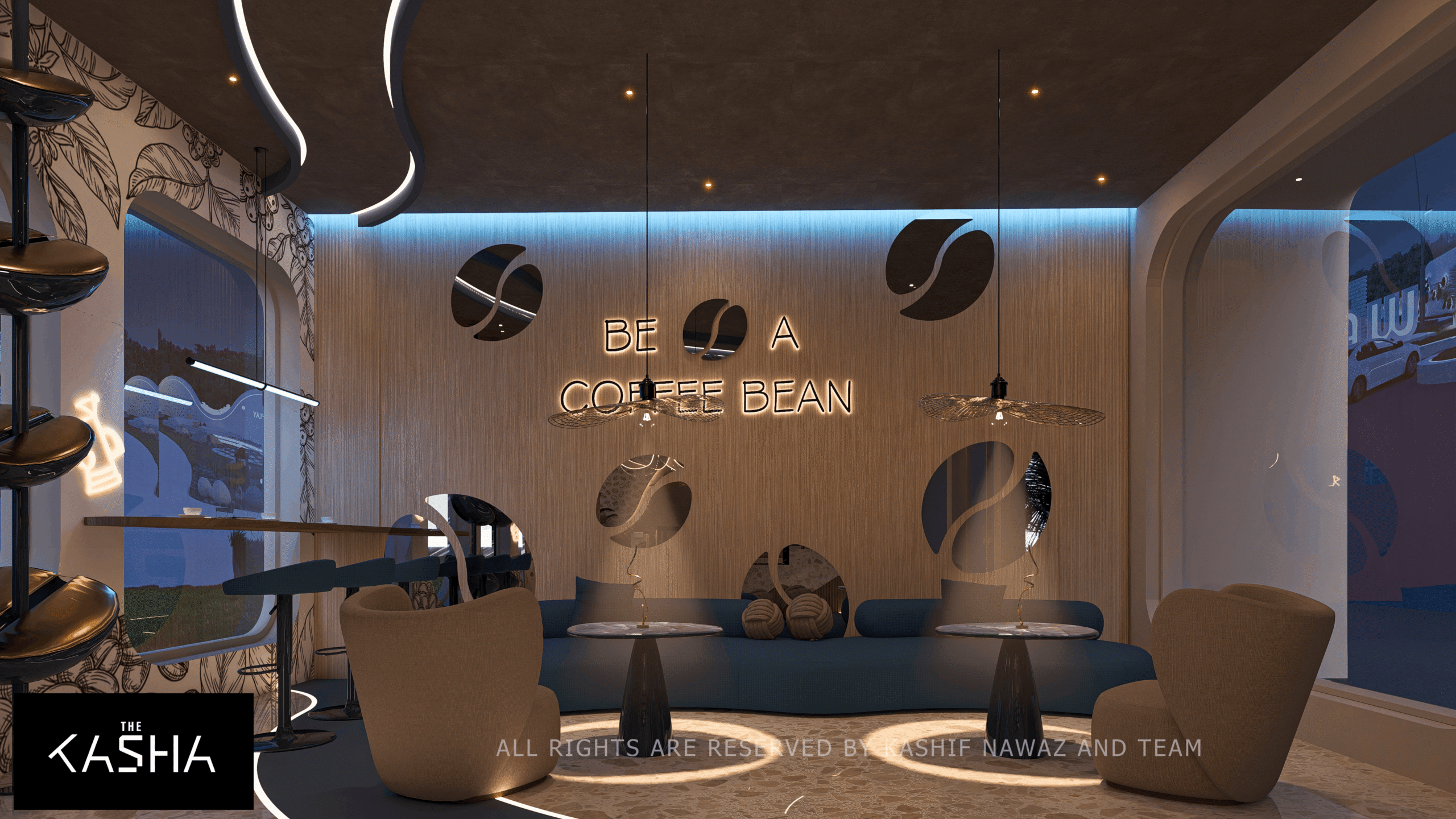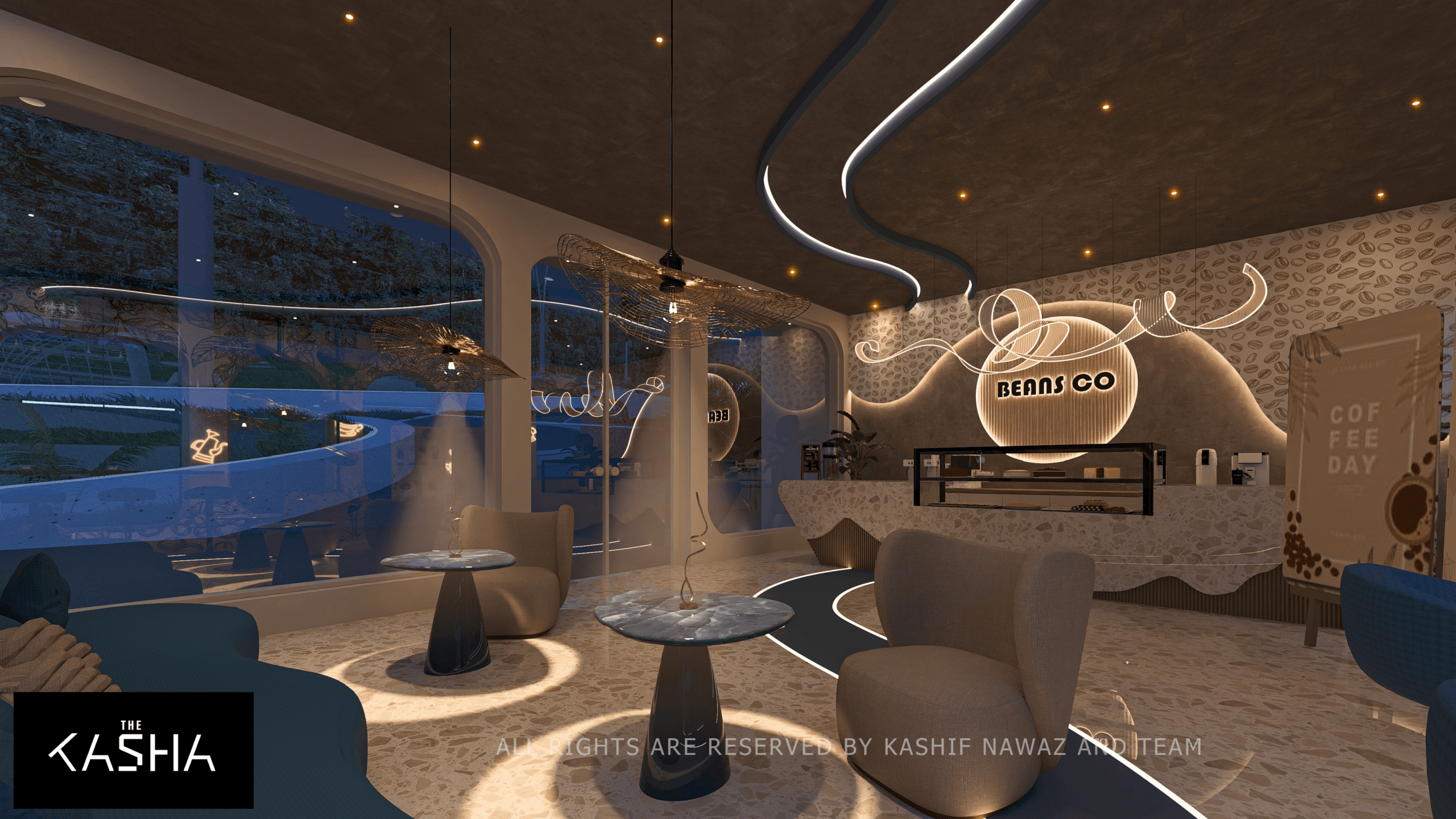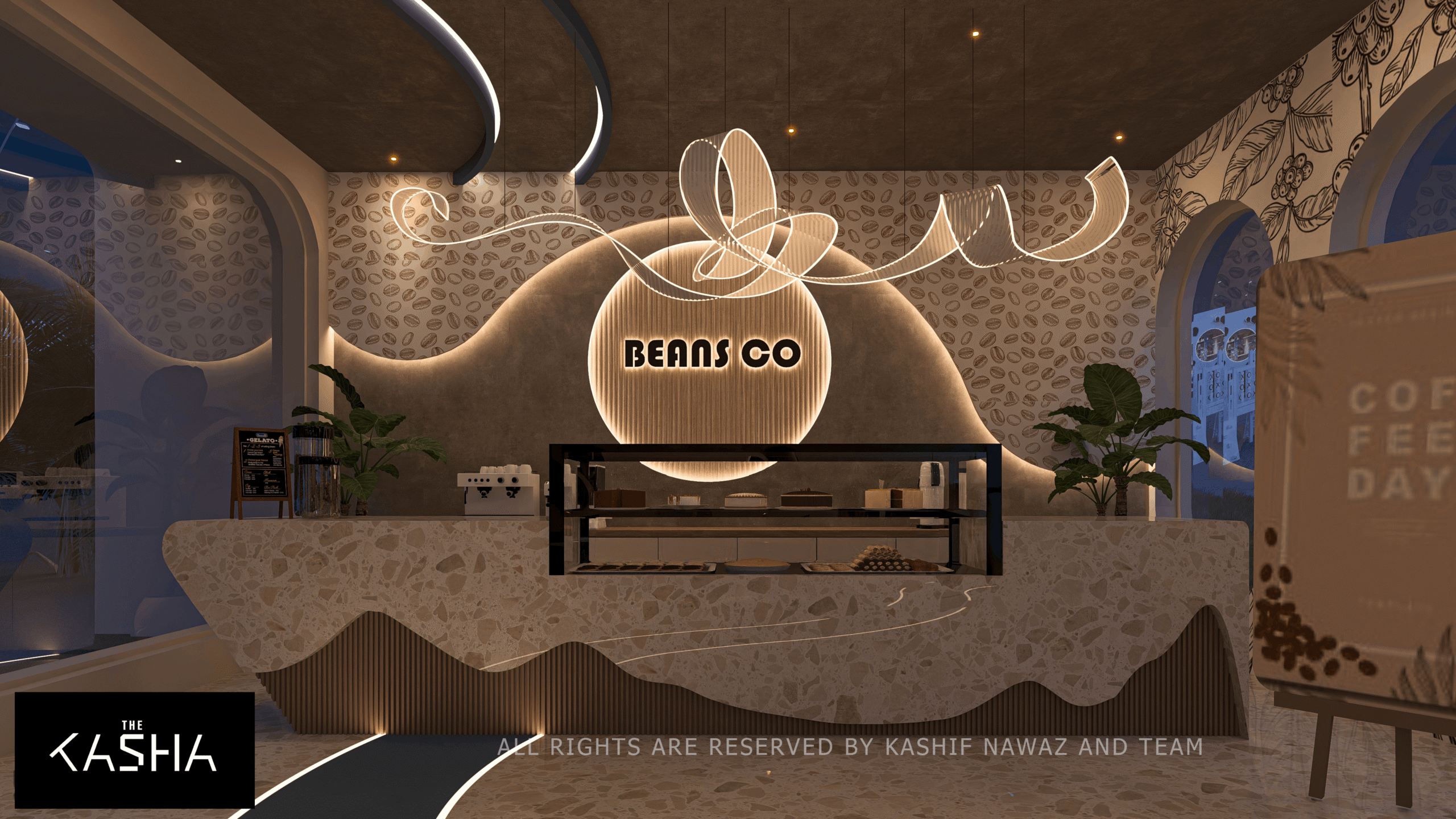 The Beans Co café is conceived as a warm, contemporary space that blends organic forms with a refined retail experience. The design is inspired by the natural journey of coffee beans, reflected through fluid counter profiles, curved ceilings, and soft, continuous lighting elements that guide movement and focus.