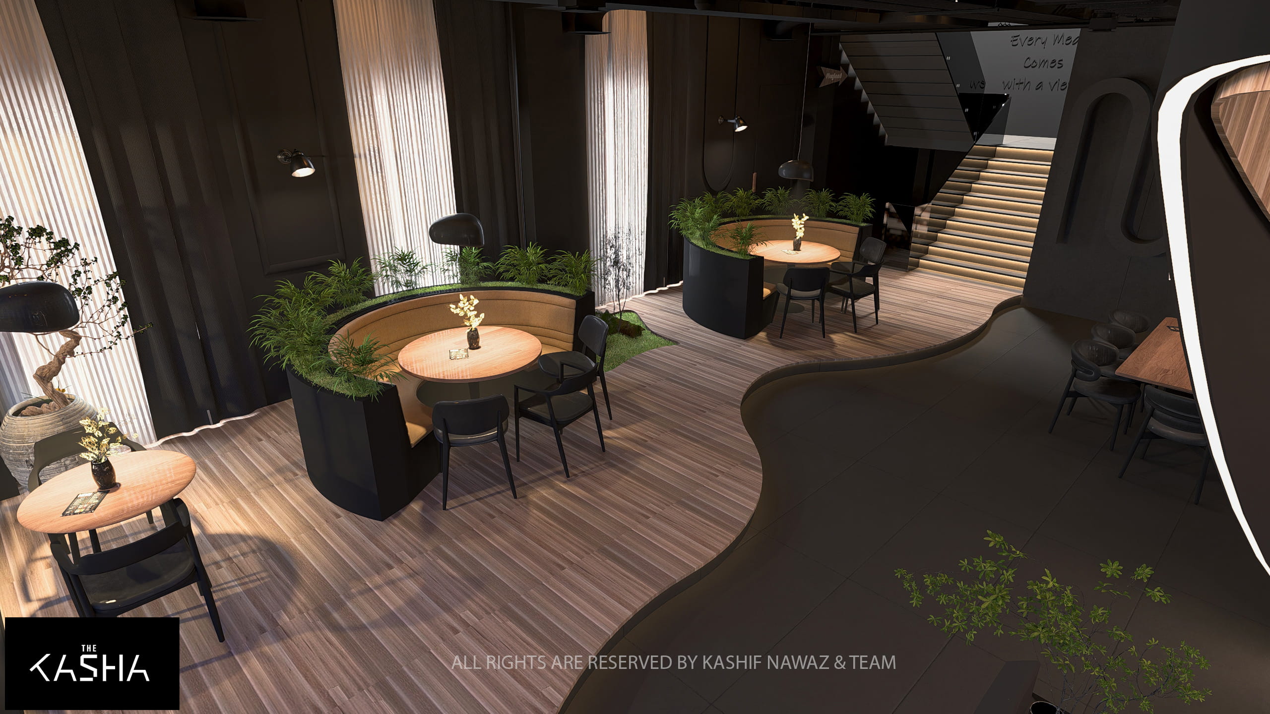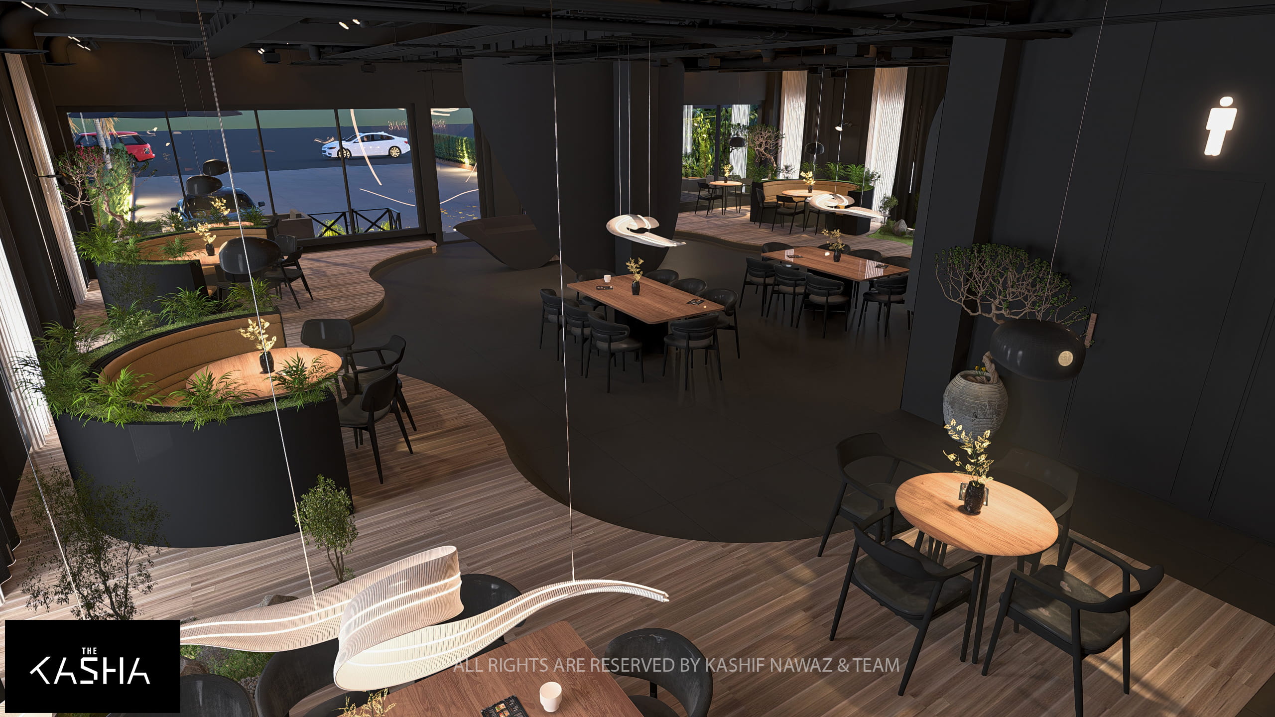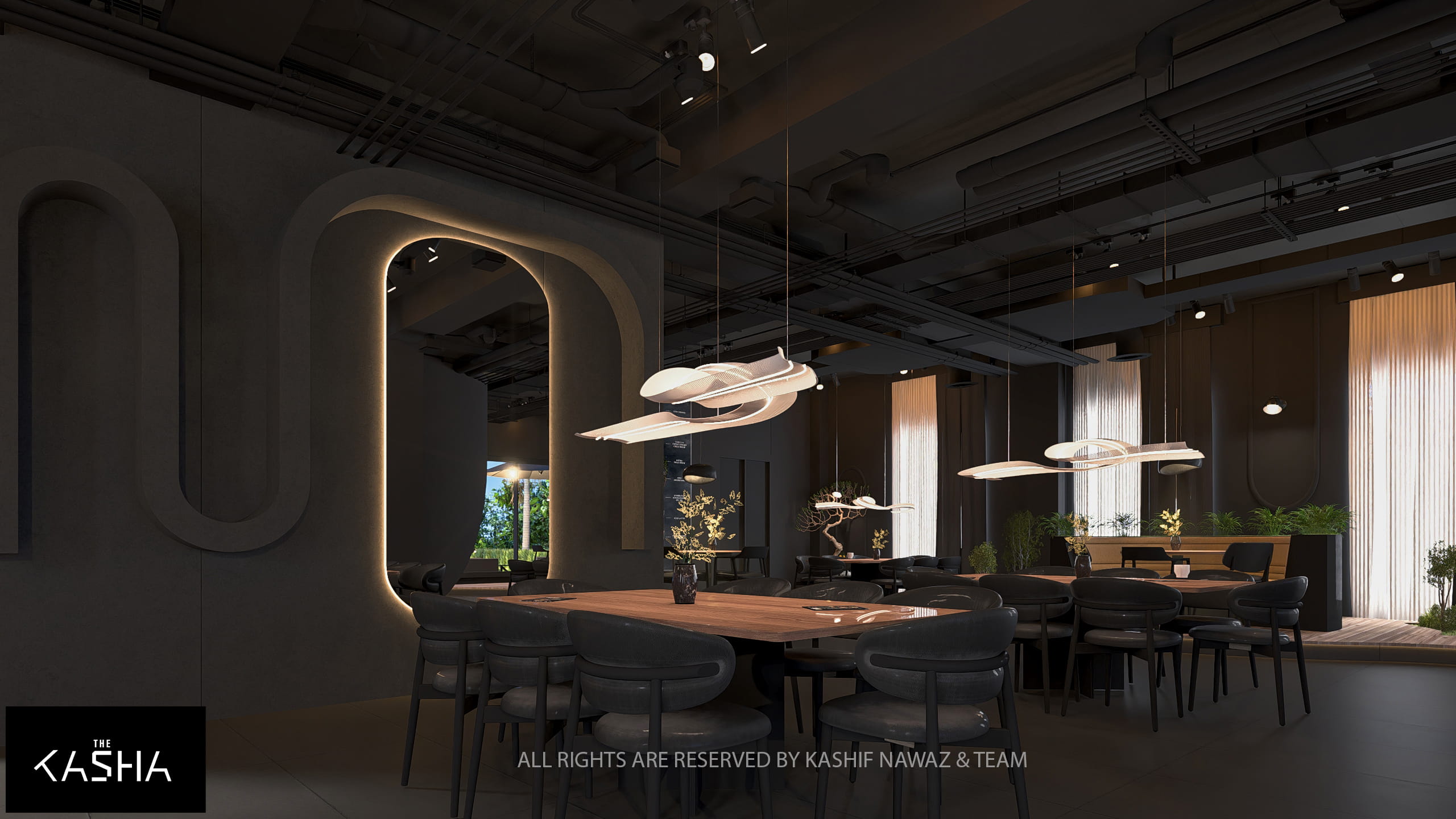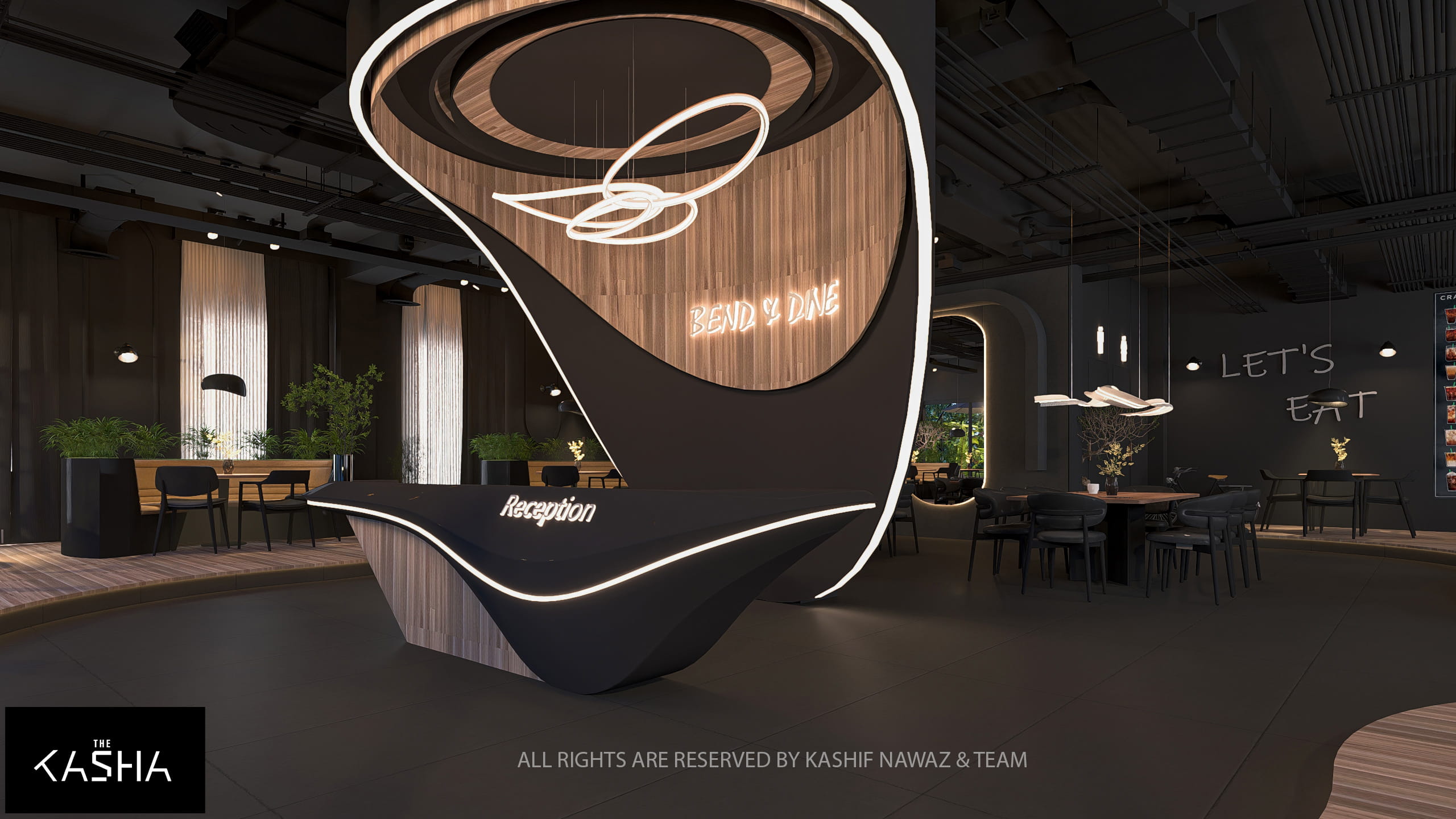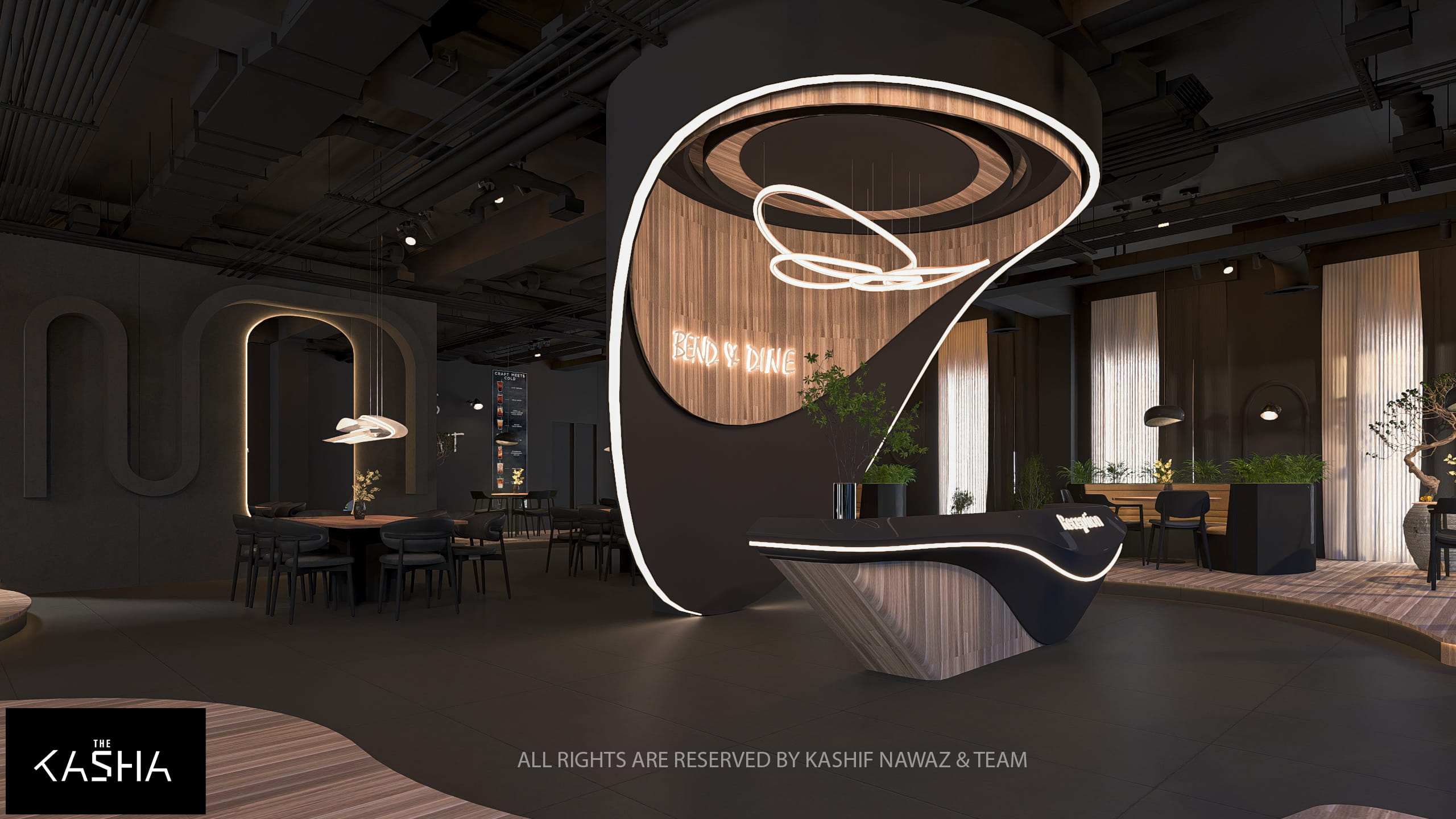 This project showcases a modern restaurant and café design that combines fluid architectural forms with a refined, contemporary aesthetic. The design is centered around bold sculptural elements, warm wood textures, and a dark neutral palette, creating a space that feels both dramatic and inviting.