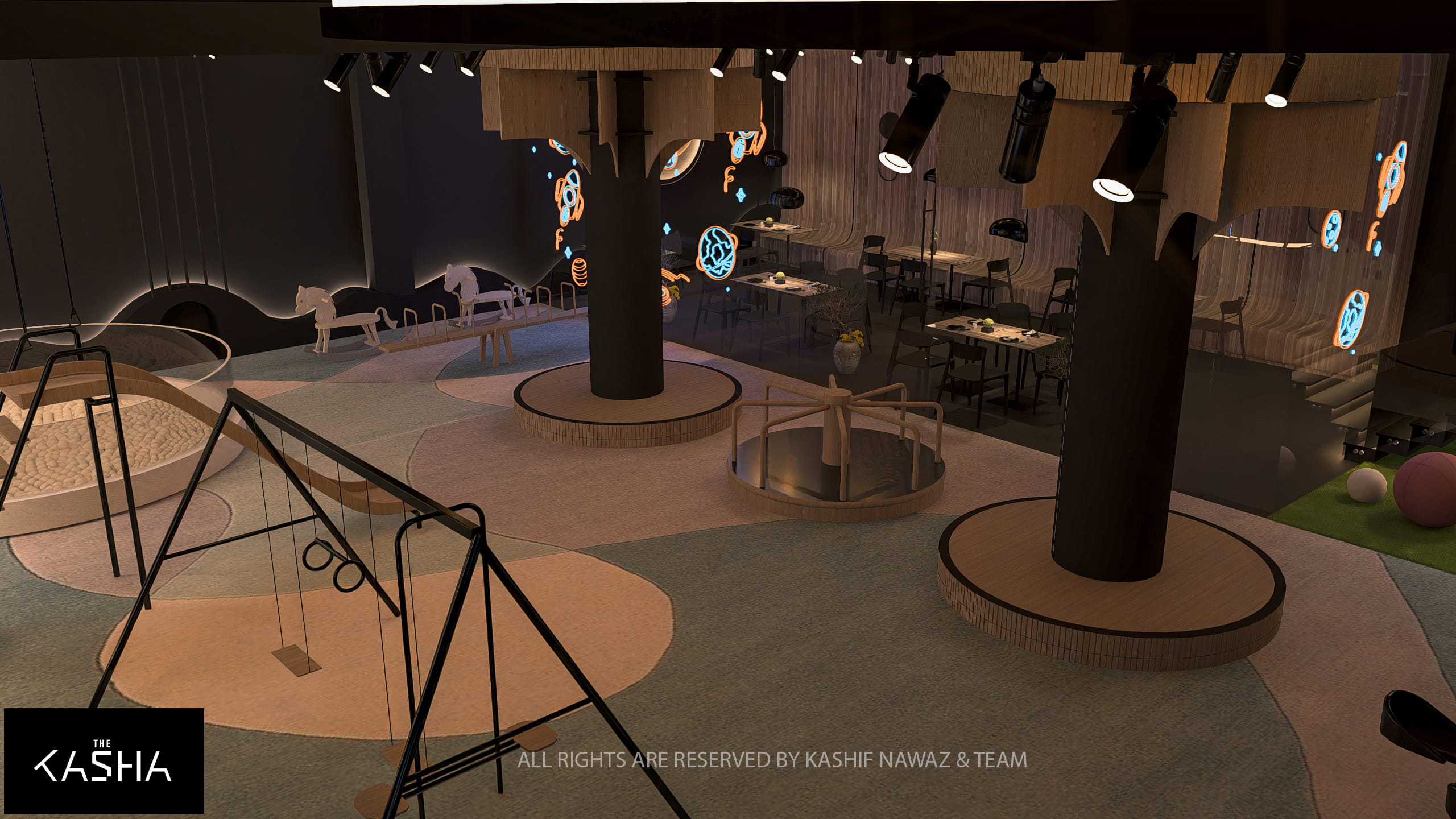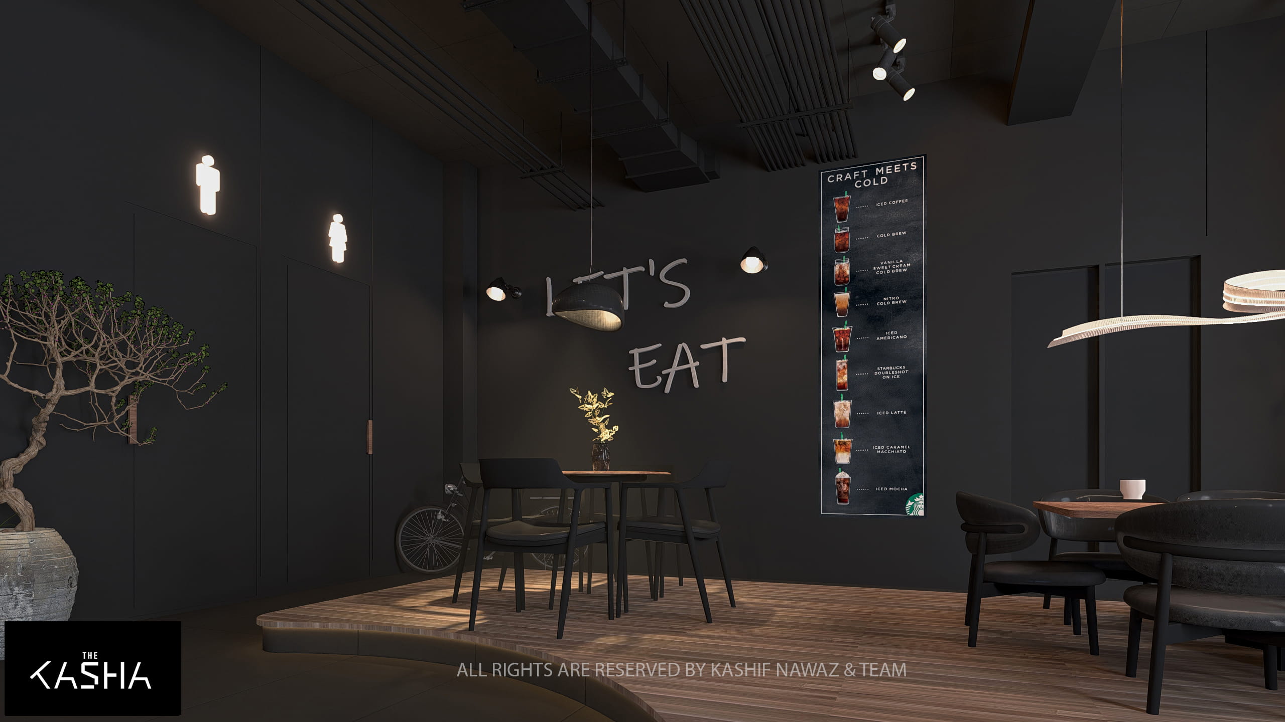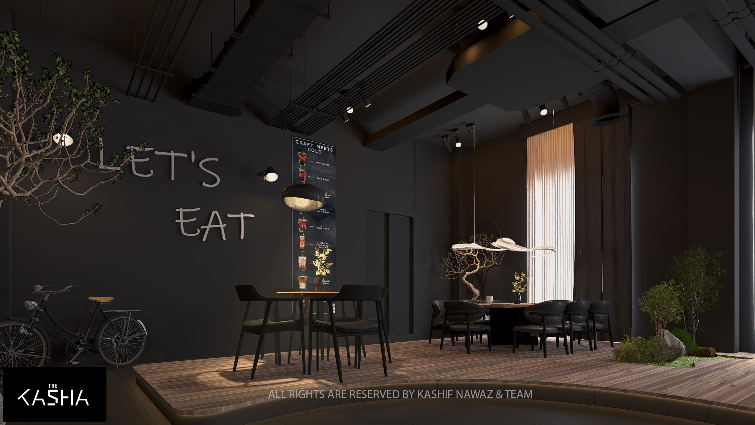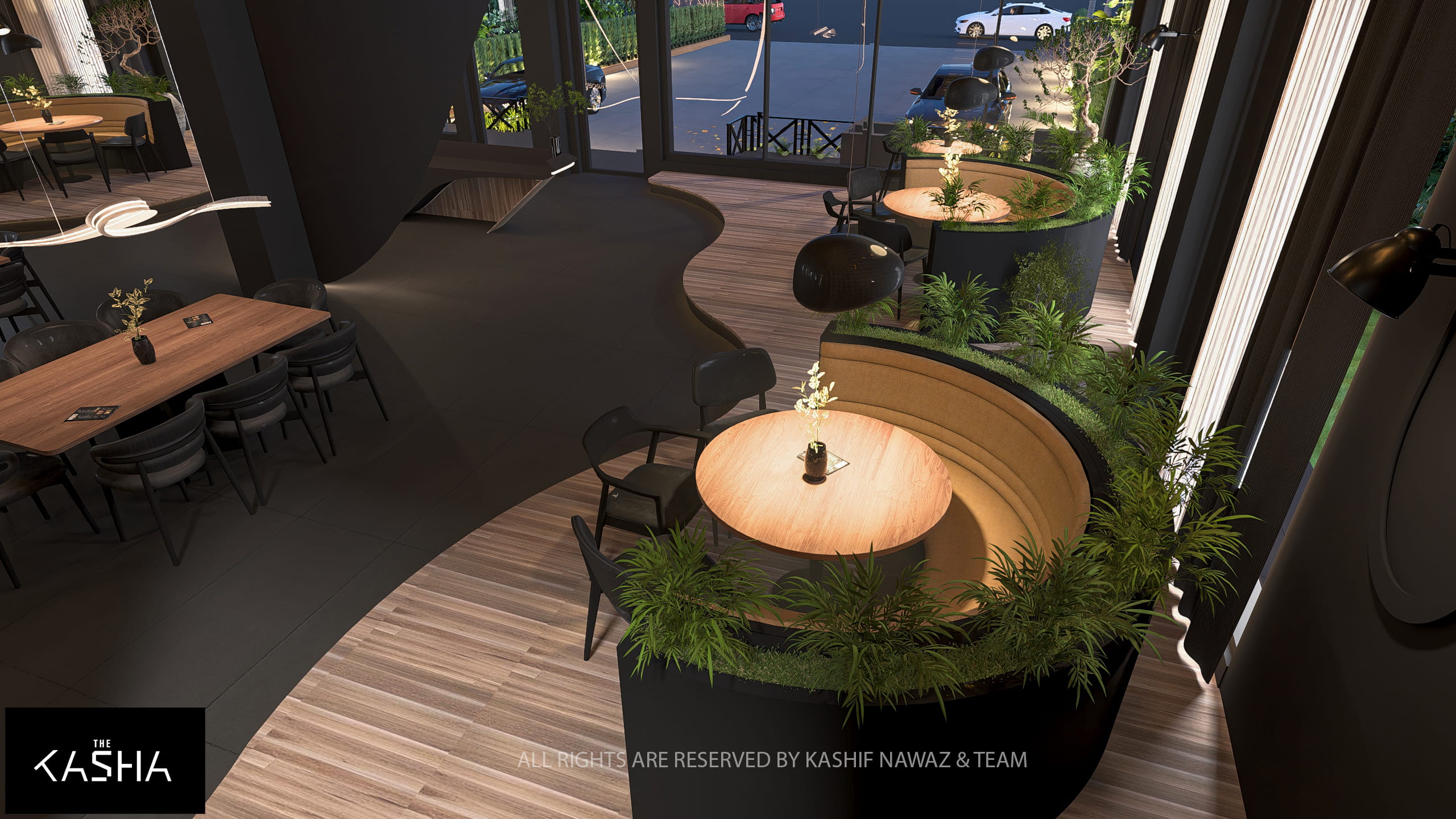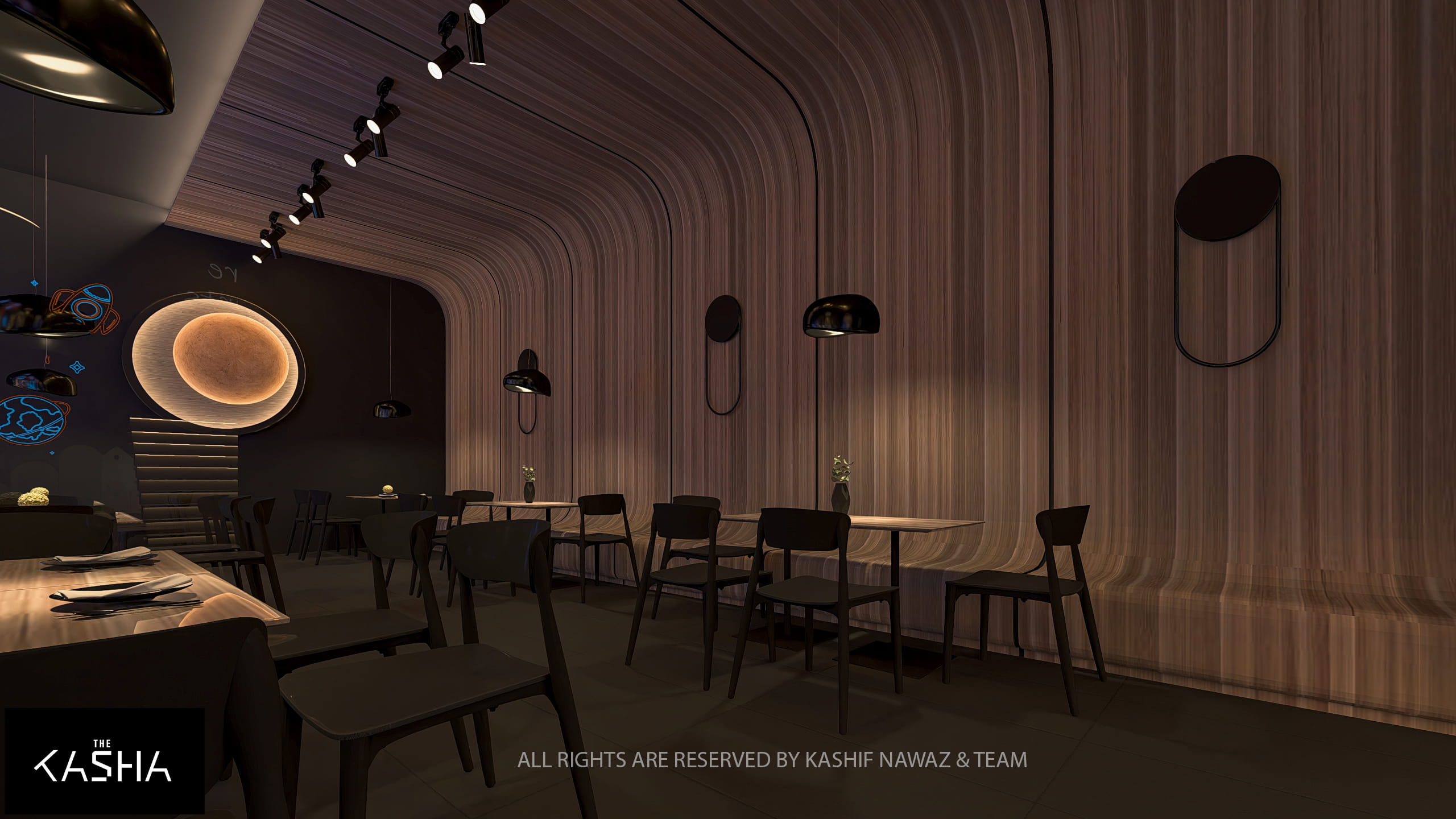 This project showcases a modern restaurant and café design that combines fluid architectural forms with a refined, contemporary aesthetic. The design is centered around bold sculptural elements, warm wood textures, and a dark neutral palette, creating a space that feels both dramatic and inviting.