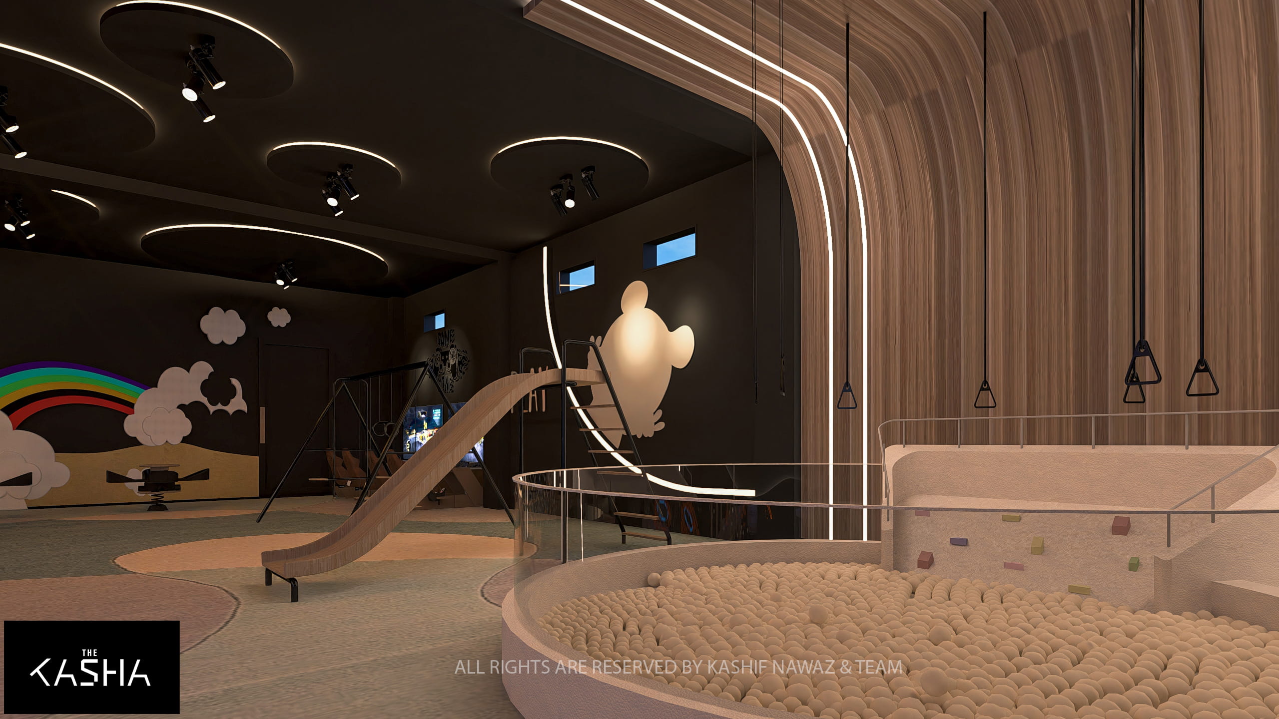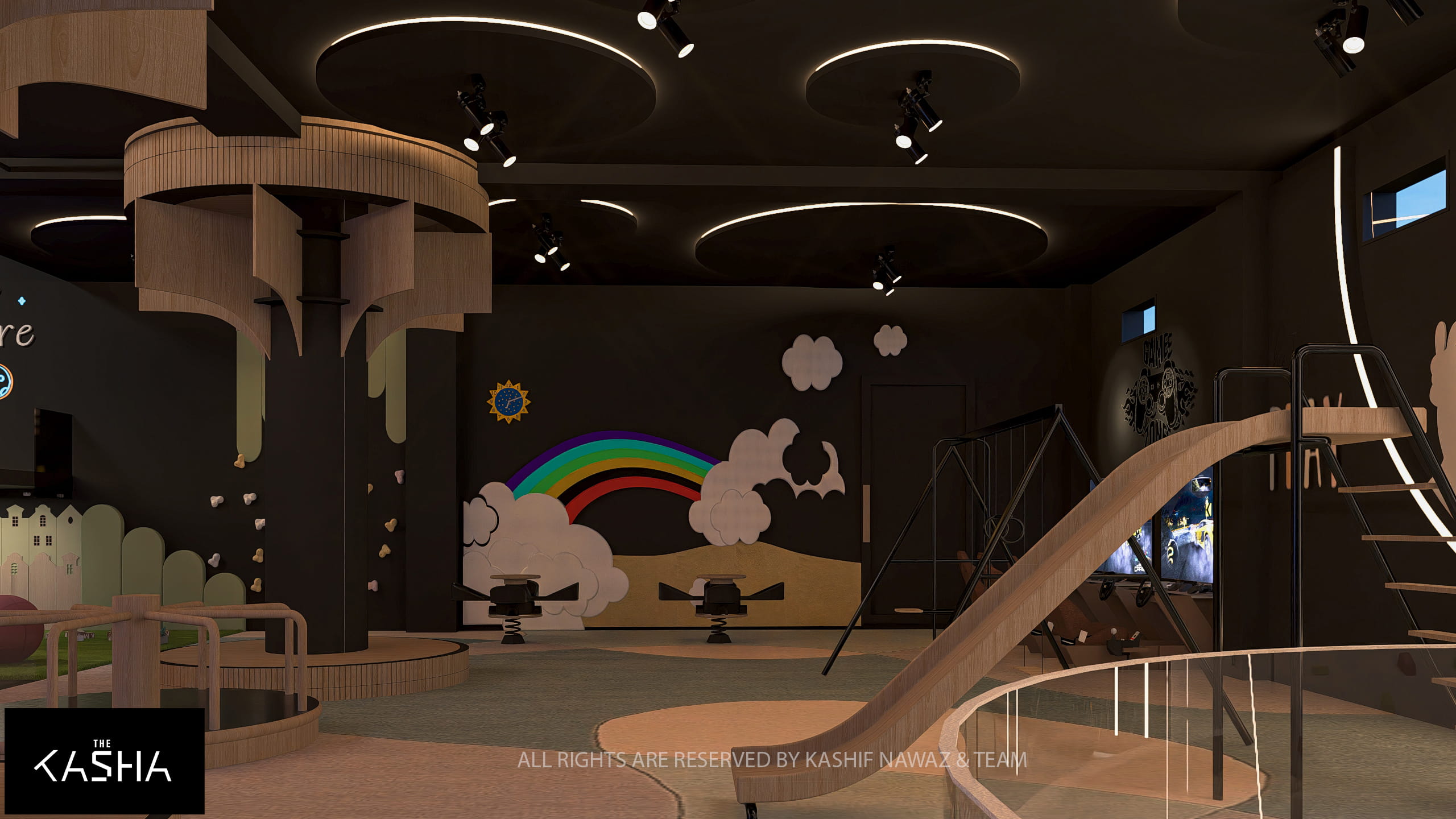 The reception area is conceived as a statement piece, featuring seamless curves, integrated lighting, and a layered ceiling installation that establishes a strong visual identity upon entry. Soft illumination and natural materials balance the bold geometry and enhance spatial depth.