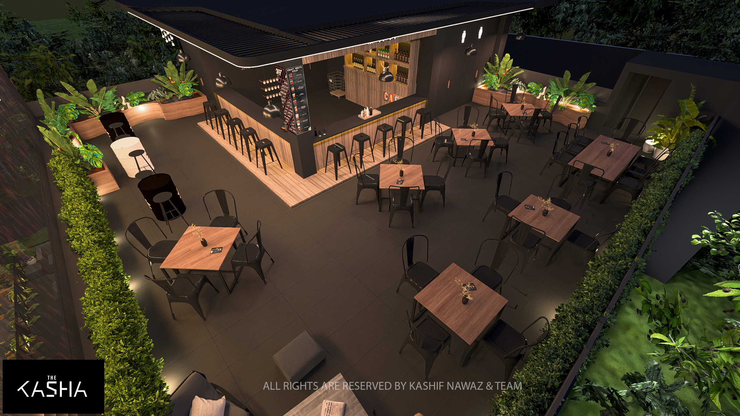 The outdoor seating and bar area extends the design language into an open-air setting, combining functional layouts with lush landscaping and ambient lighting. This space encourages social interaction while maintaining visual continuity with the interior.
