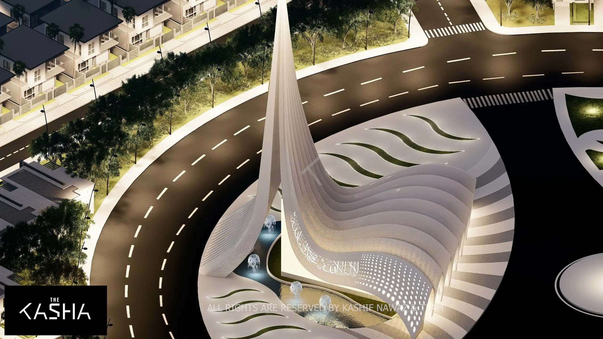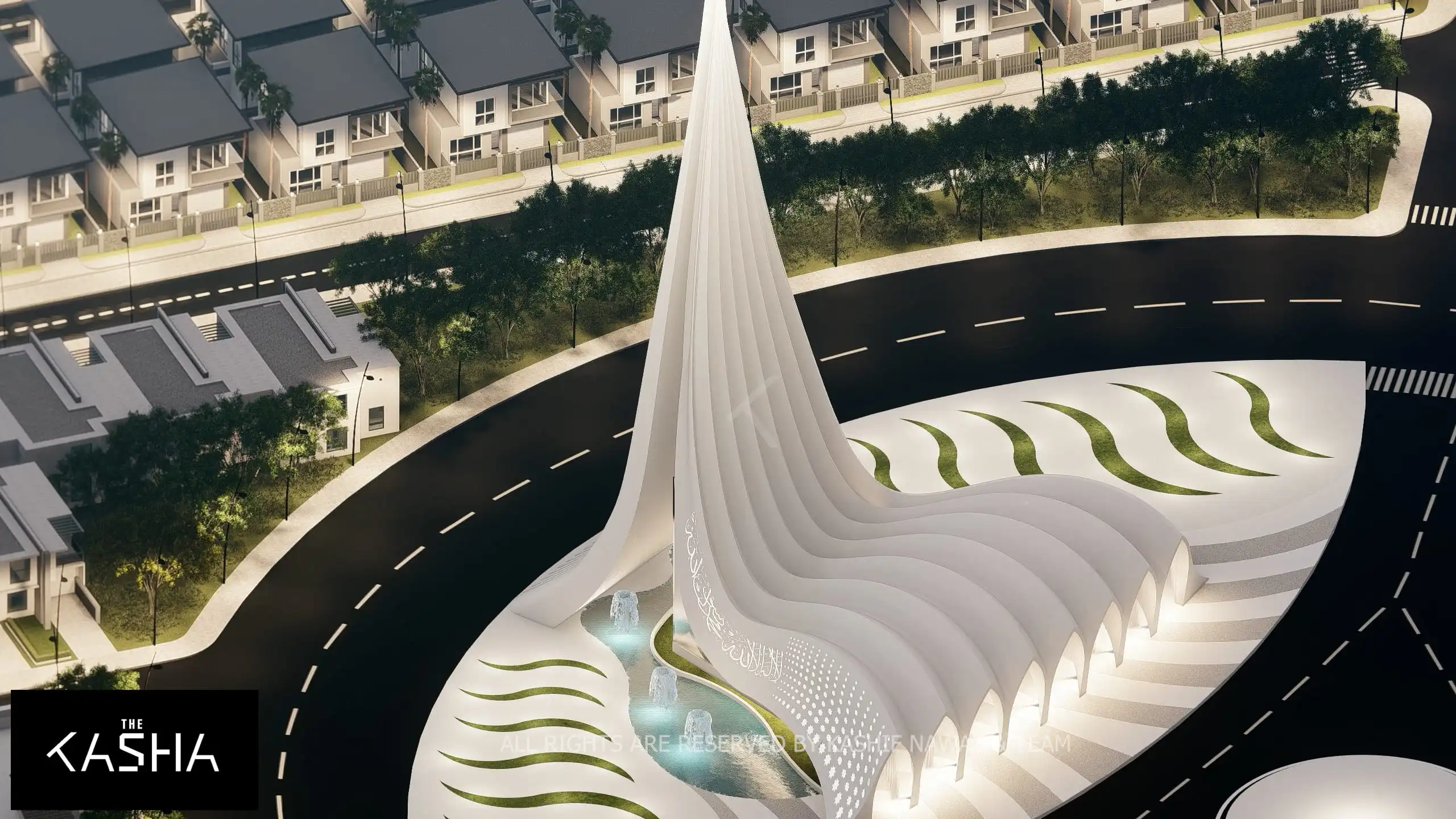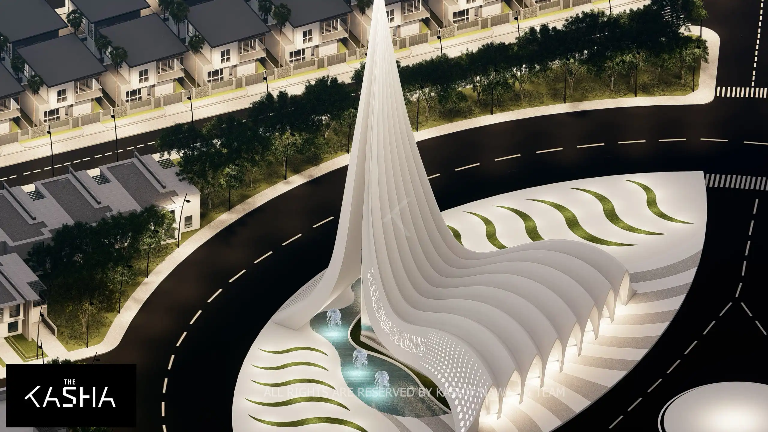 Modern Islamic patterns and illuminated calligraphy are integrated into the façade, blending tradition with innovation. At night, strategic lighting accentuates the curves, vertical lines, and perforated surfaces, transforming the mosque into a glowing sculptural landmark within the housing society.