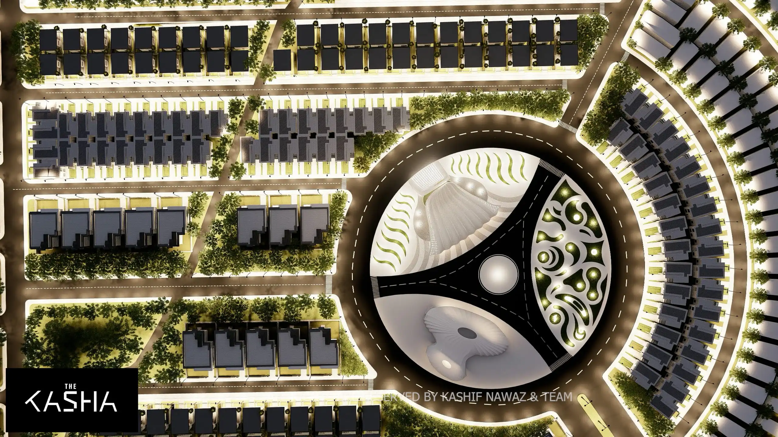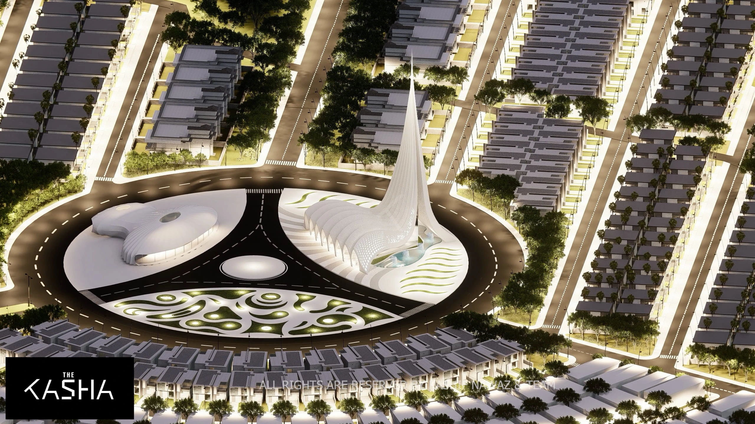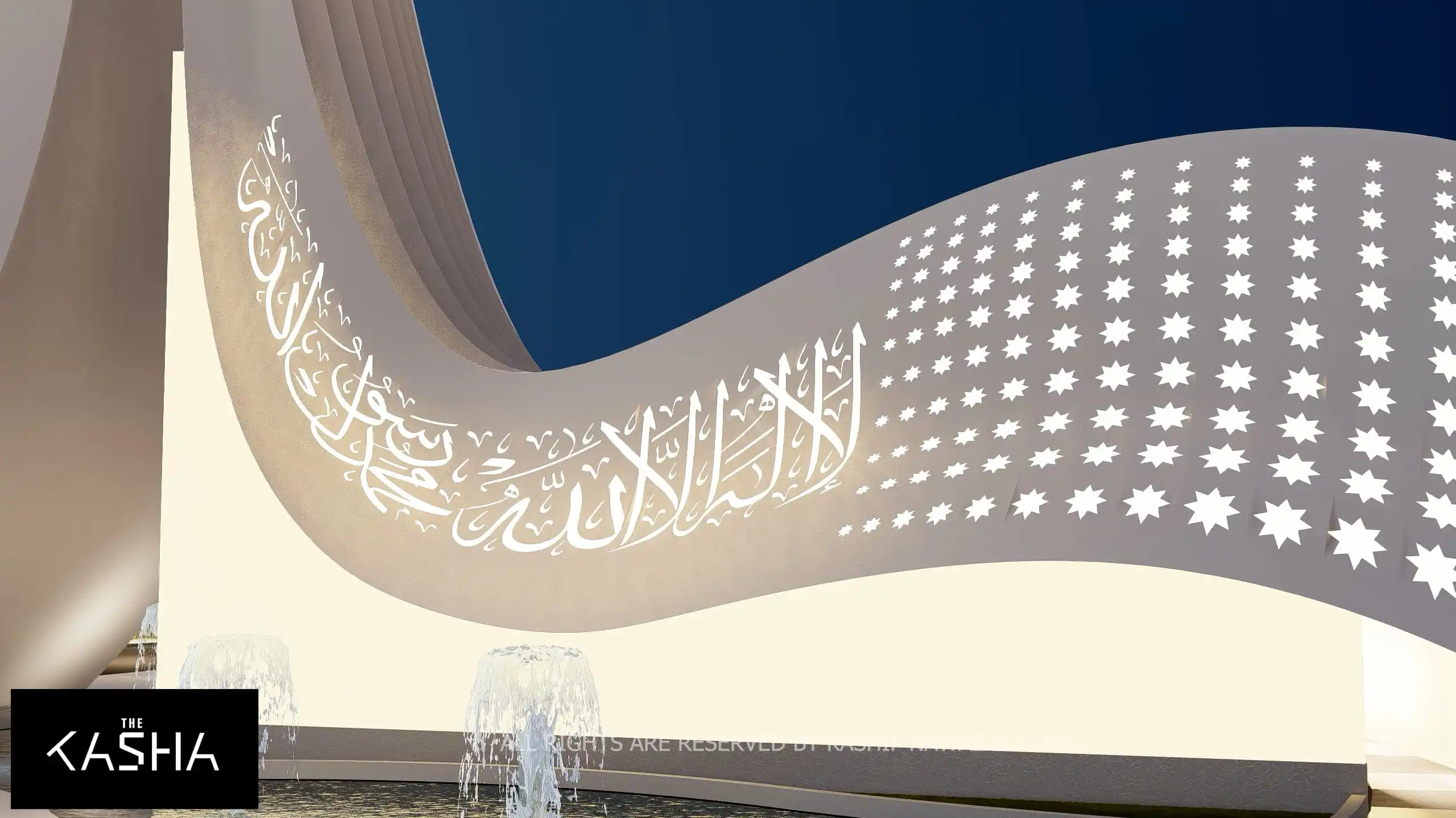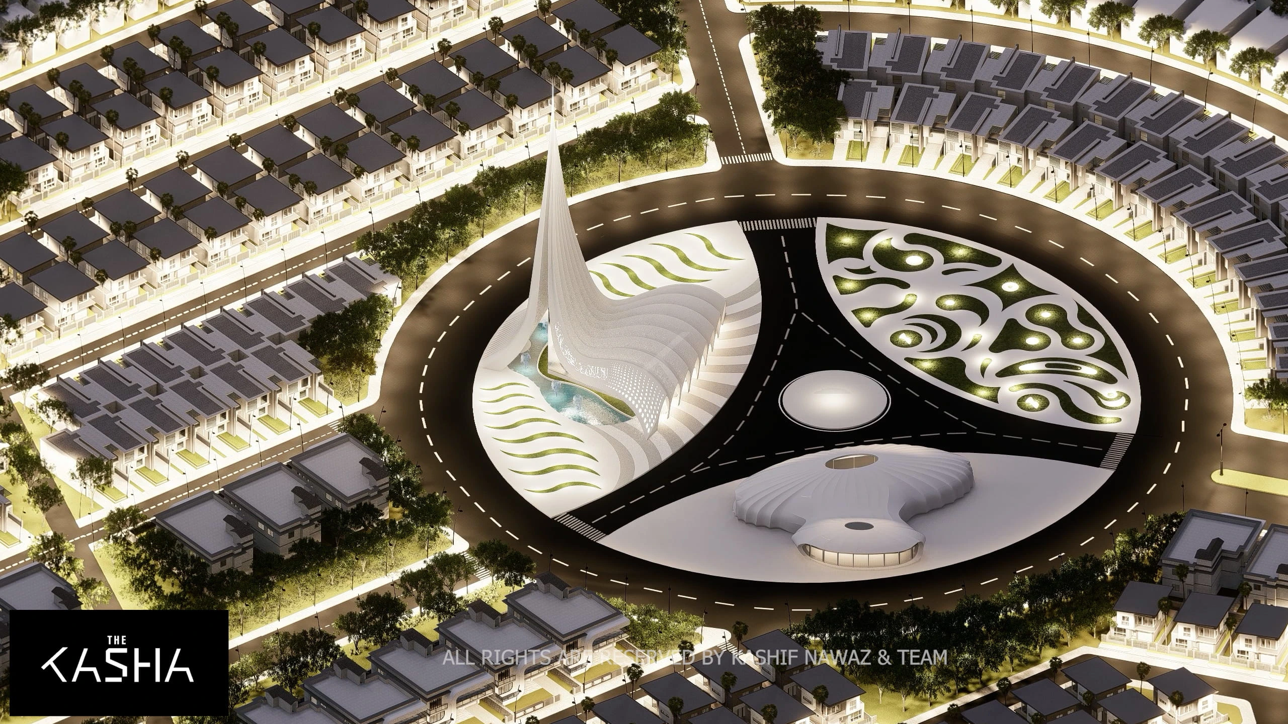 Modern Islamic patterns and illuminated calligraphy are integrated into the façade, blending tradition with innovation. At night, strategic lighting accentuates the curves, vertical lines, and perforated surfaces, transforming the mosque into a glowing sculptural landmark within the housing society.