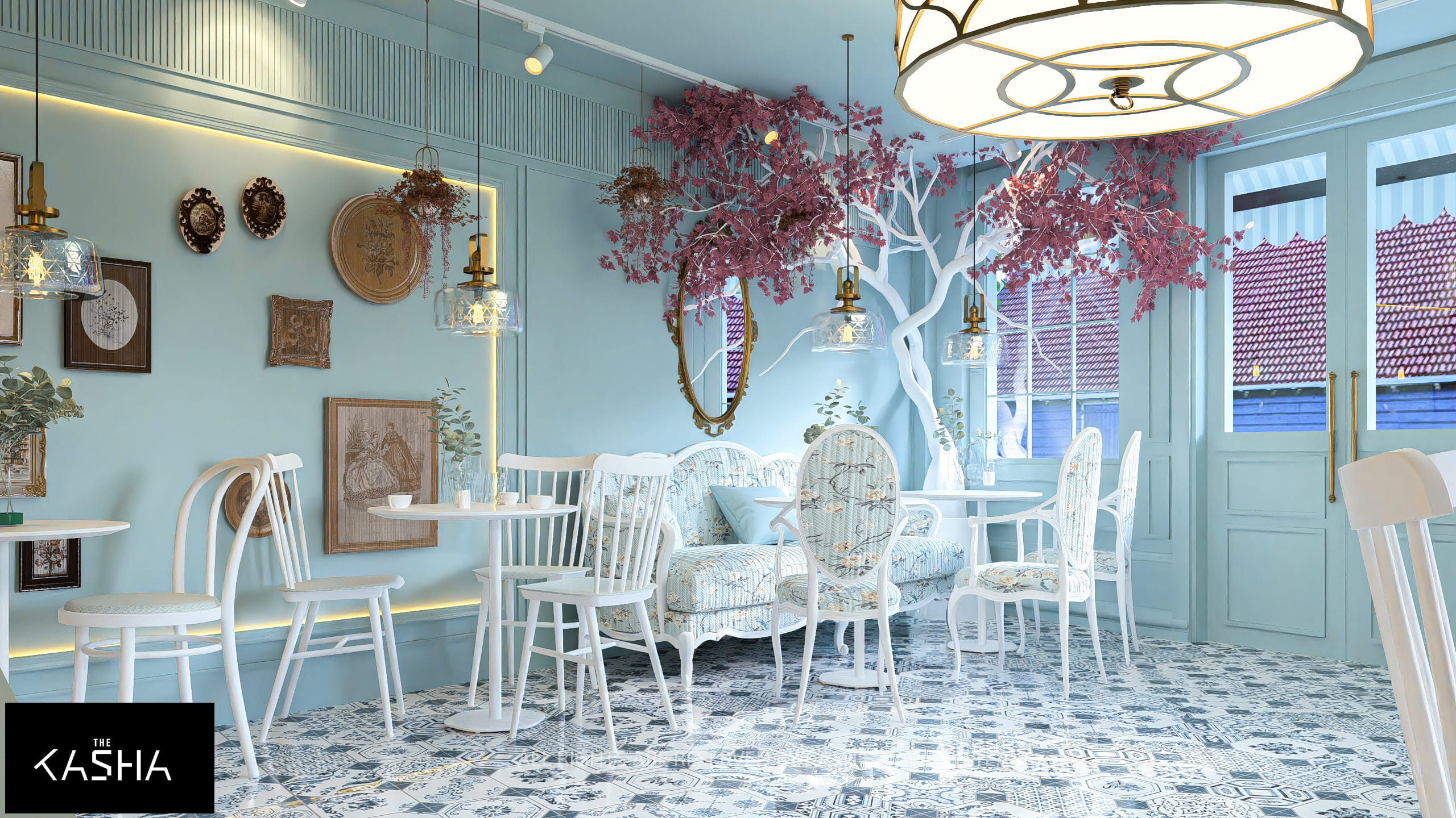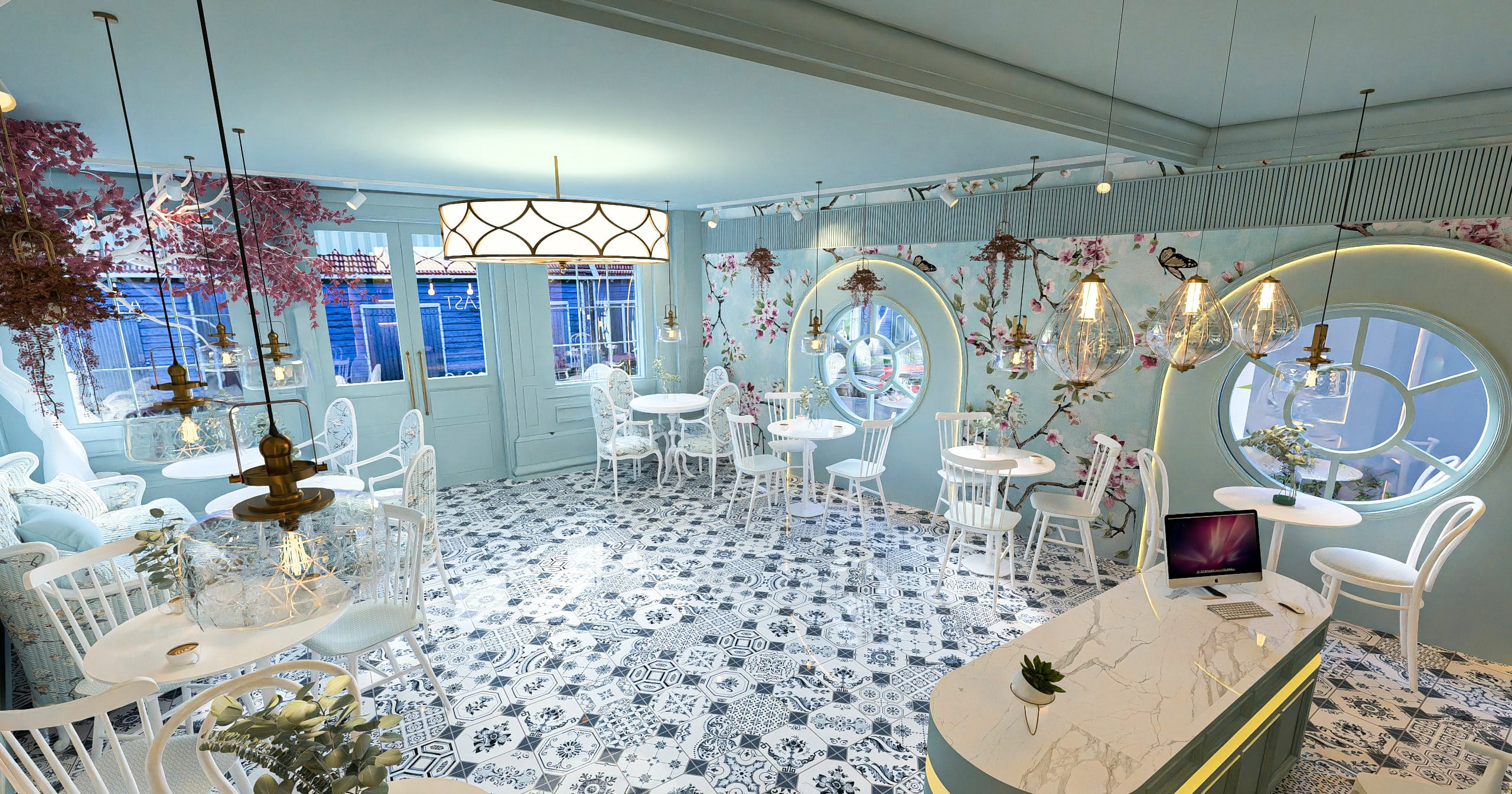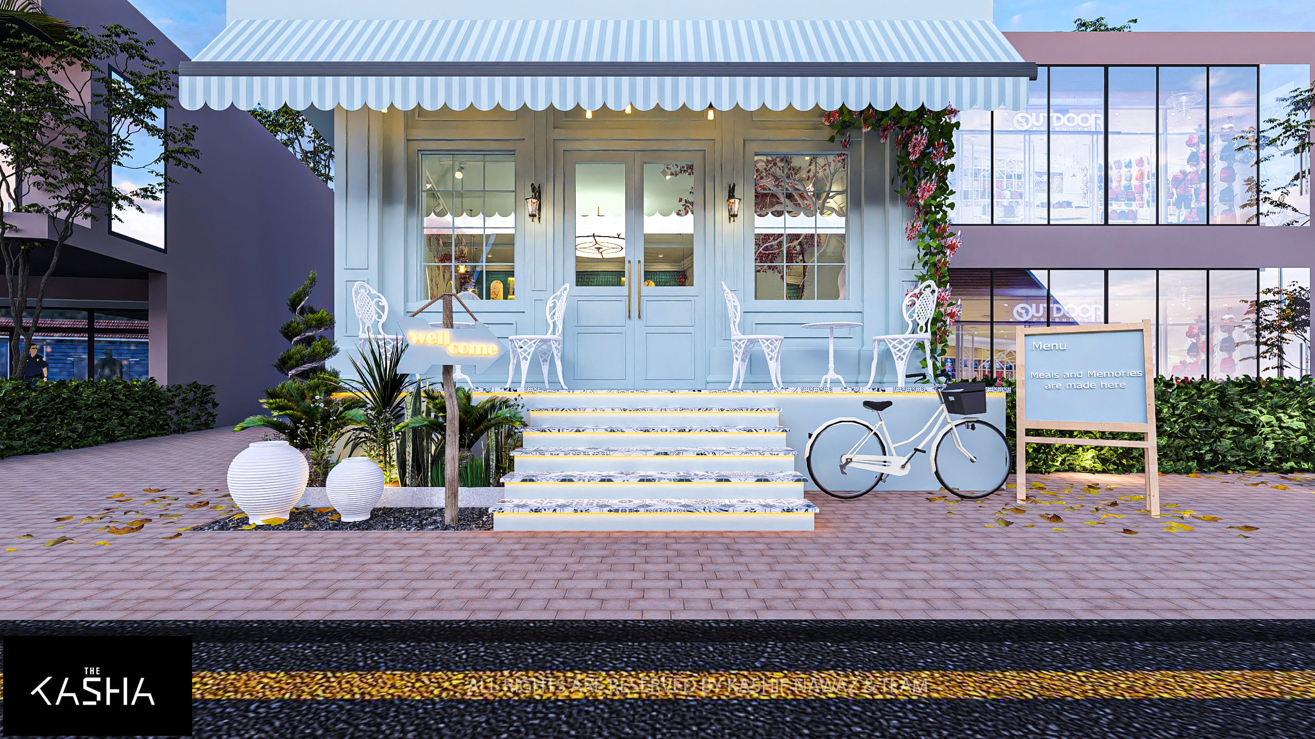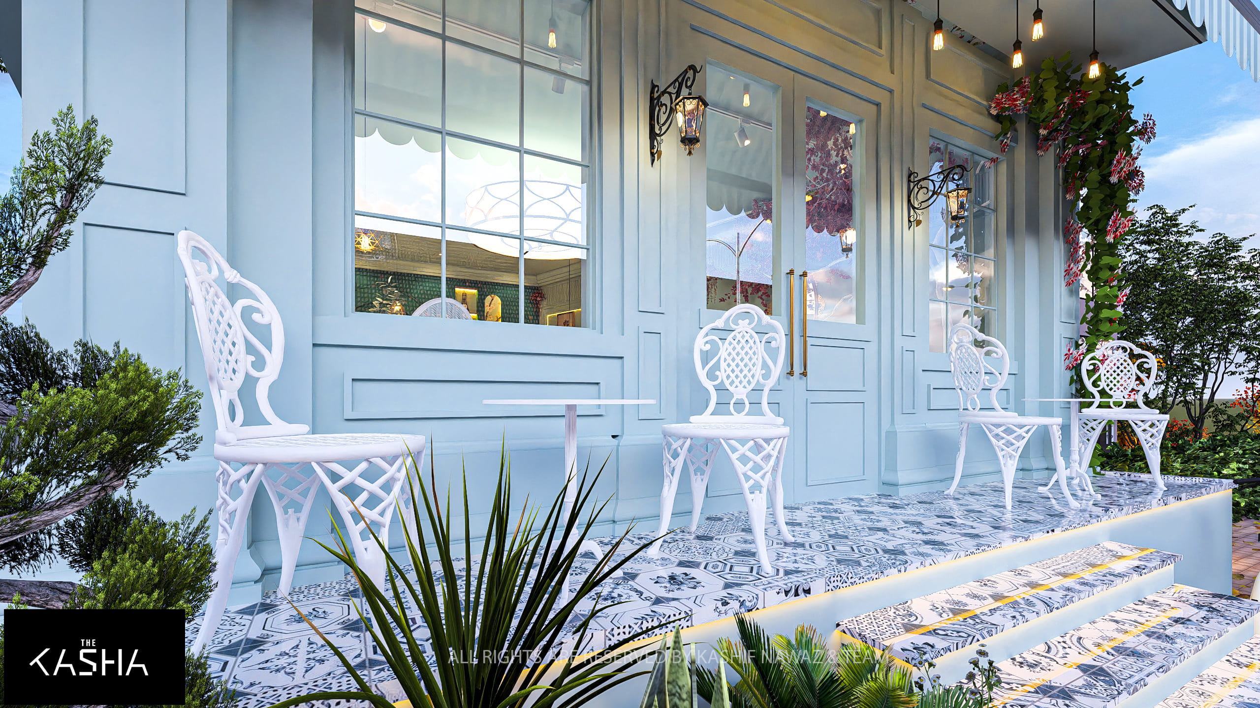 This project presents a boutique café concept inspired by European vintage charm with a fresh, contemporary twist. The exterior features a soft pastel-blue façade, striped canopy, and delicate landscaping, creating a welcoming street presence. White outdoor furniture, decorative lanterns, floral climbers, and a classic bicycle reinforce a calm, lifestyle-oriented café identity that feels approachable and memorable.