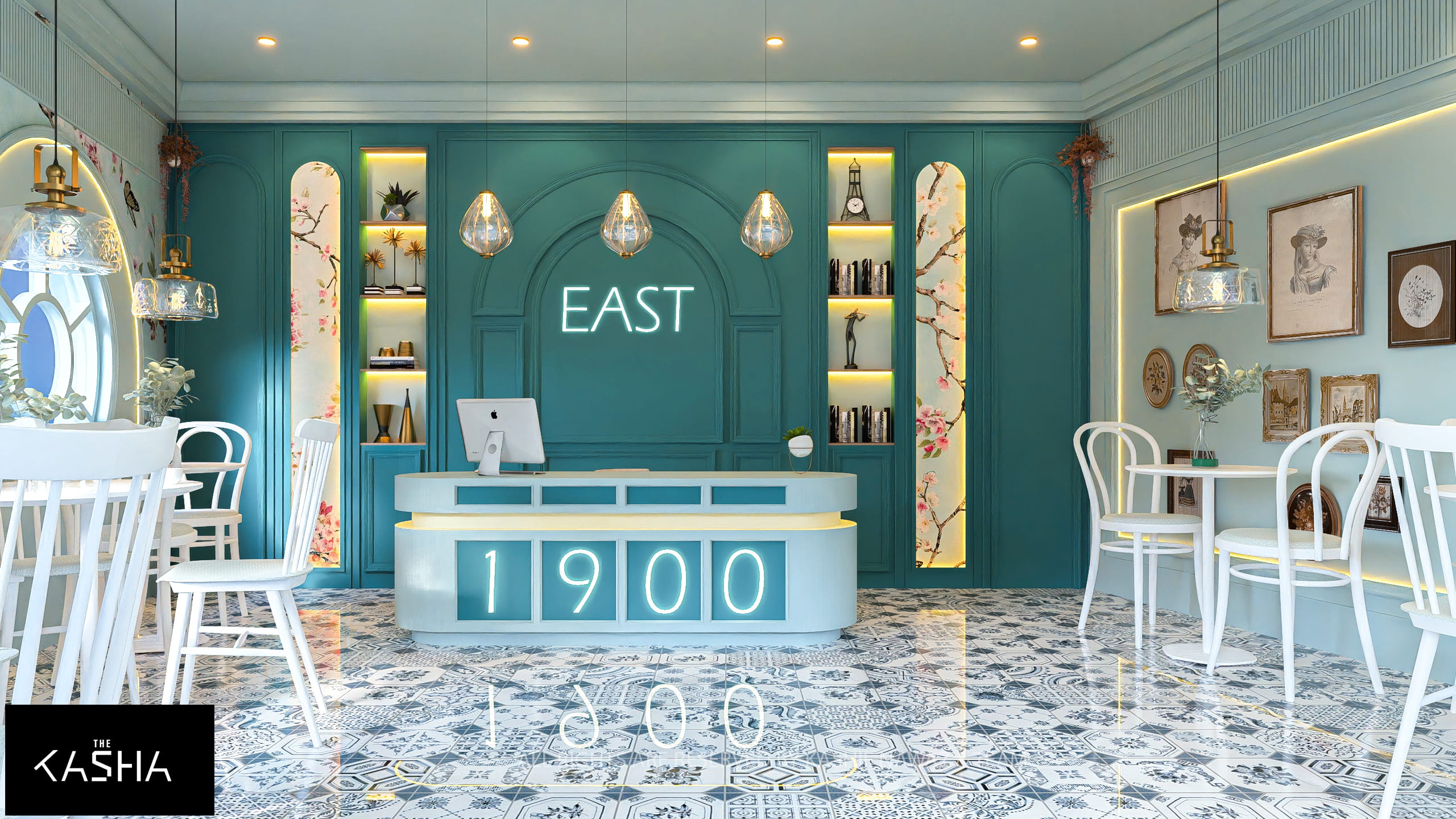 The central counter acts as a focal point, featuring clean curves, soft illumination, and subtle branding (“EAST 1900”) that blends seamlessly into the architecture. Thoughtfully selected lighting—glass pendants and statement fixtures—creates an intimate yet bright atmosphere. Overall, the design balances elegance and comfort, offering a serene, Instagram-worthy café experience rooted in nostalgia and modern craftsmanship.