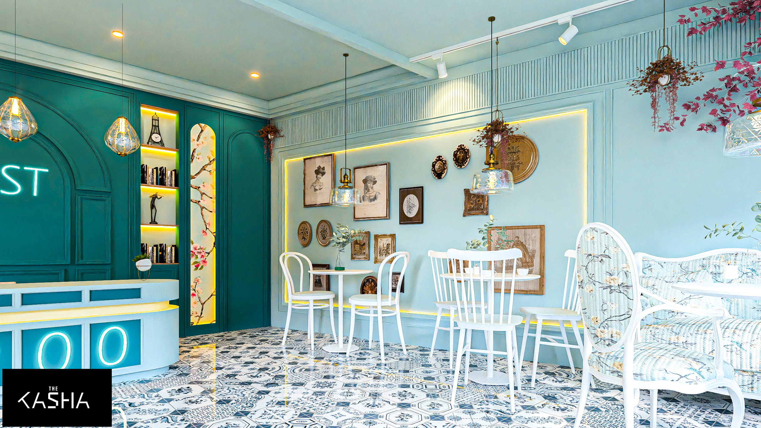 The interior is defined by a harmonious palette of teal, powder blue, and white, paired with warm brass accents. Patterned encaustic-style floor tiles add visual richness and movement, while arched wall panels and curated wall art introduce a refined, timeless character. Custom shelving with integrated lighting highlights decorative elements and books, enhancing depth and warmth.