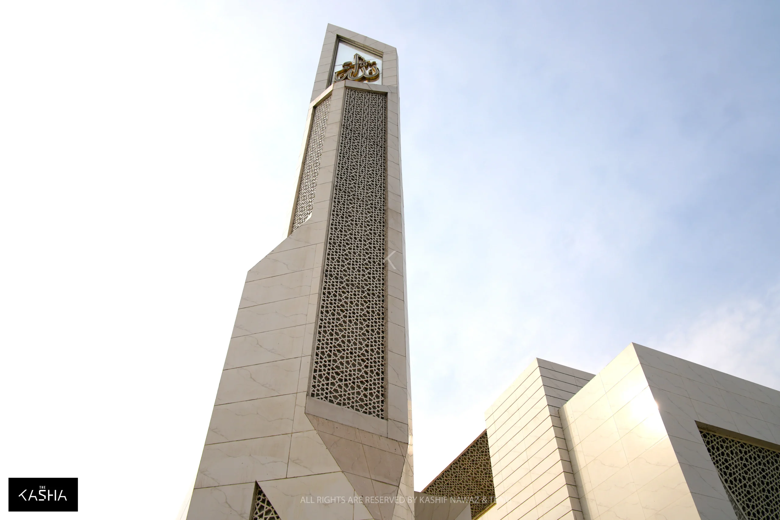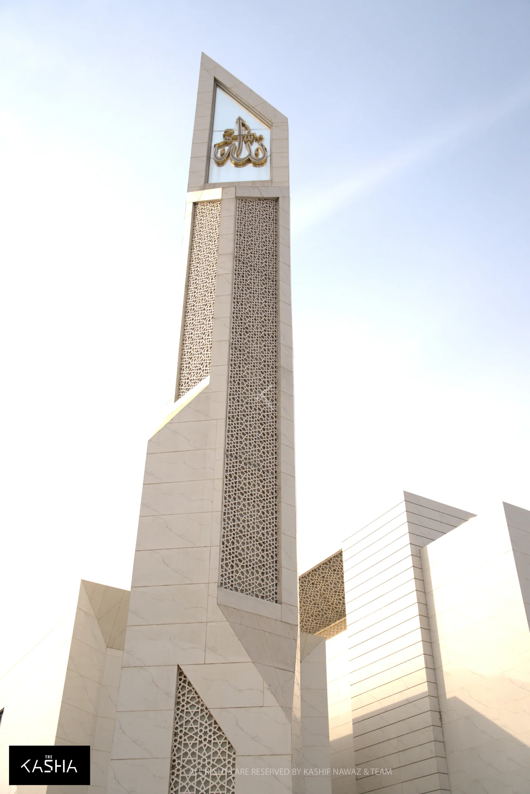 The minaret, standing at approximately 75 feet, is designed as a sculptural vertical element that appears identical from both front and rear elevations. Its form follows the same star-and-curve design language as the rest of the mosque. A transparent glass panel near the top features the name of the Almighty, subtly illuminated to enhance the architectural expression and reinforce the spiritual essence of the structure.
