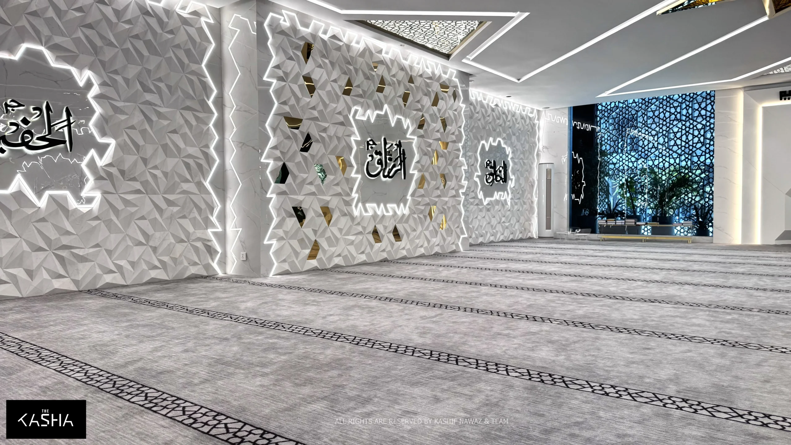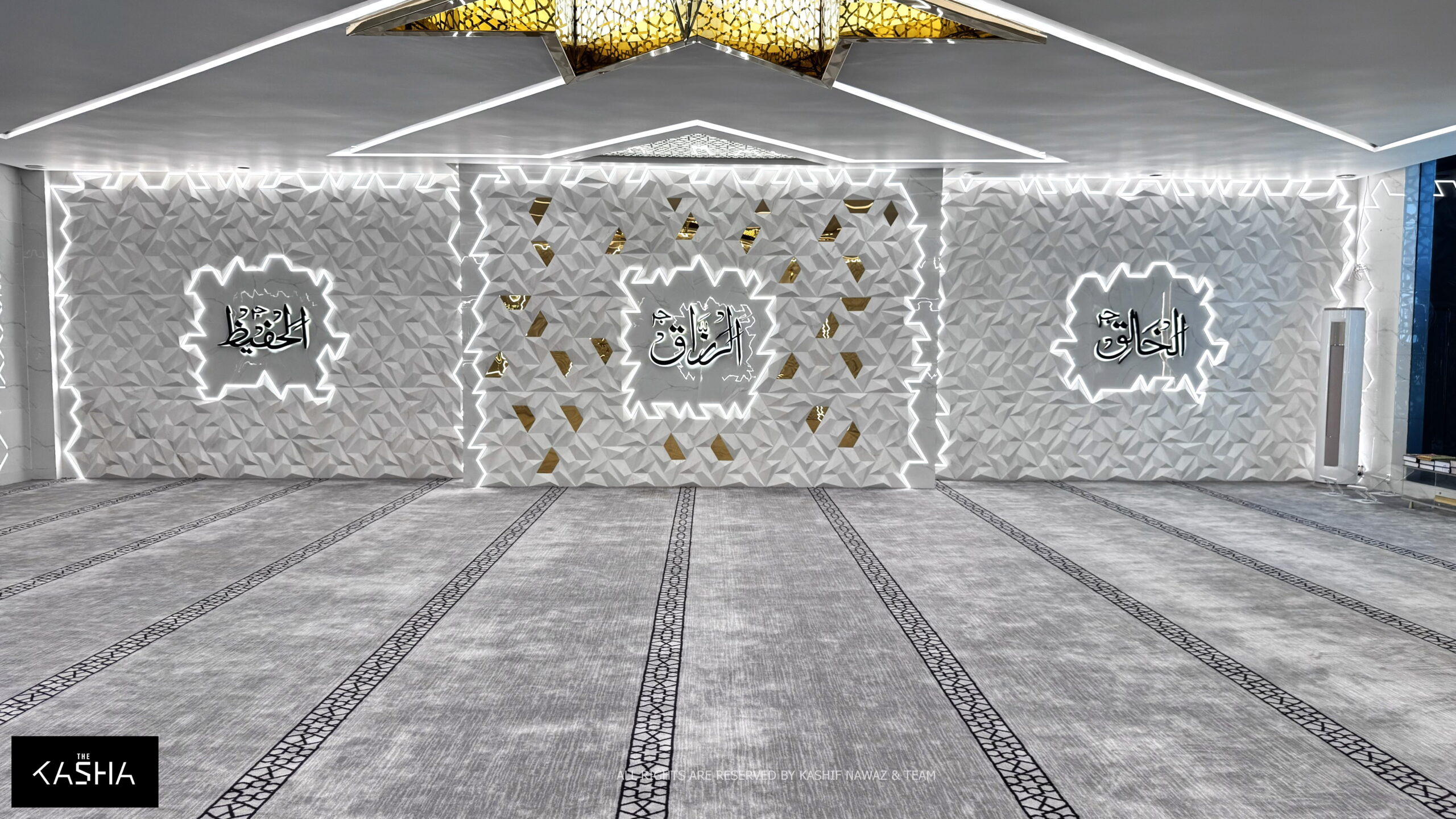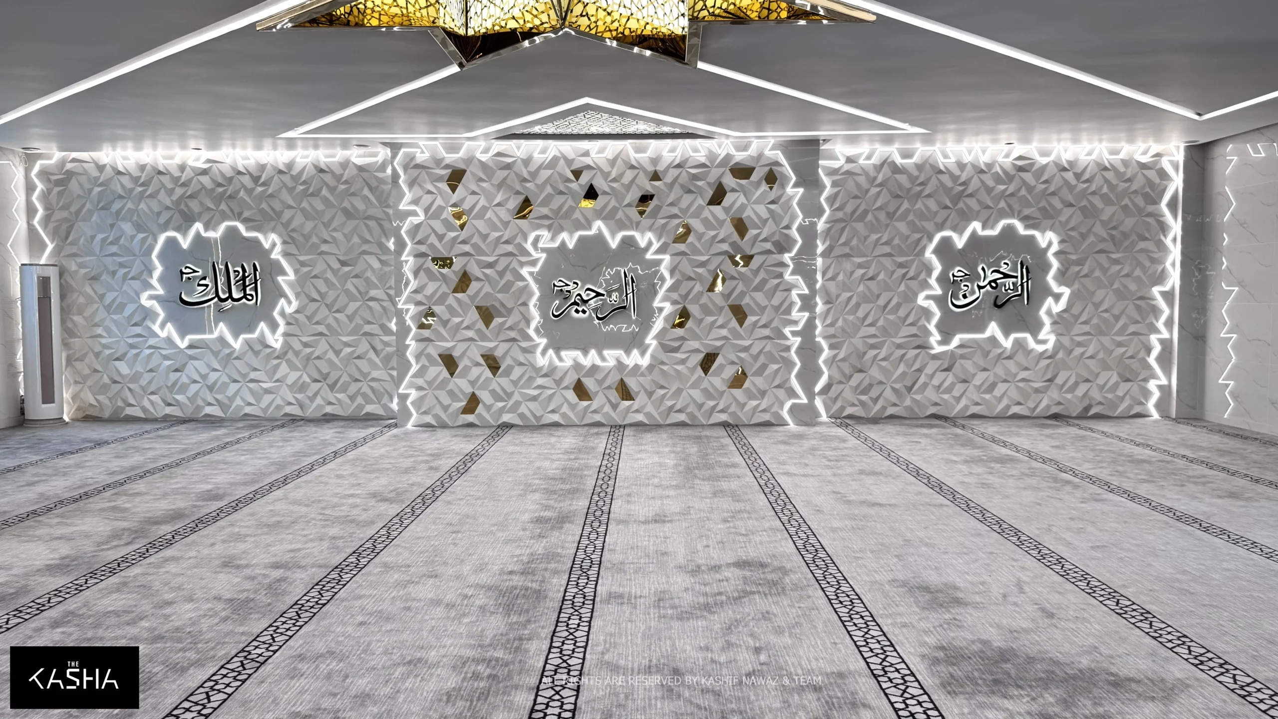 Inside the mosque, the design continues seamlessly. The interior ceiling features a prominent star-shaped element at the center, acting as a focal point and a source of illumination. The walls are finished with custom-designed 3D panels, adding depth, texture, and visual rhythm while maintaining a calm and minimal aesthetic.