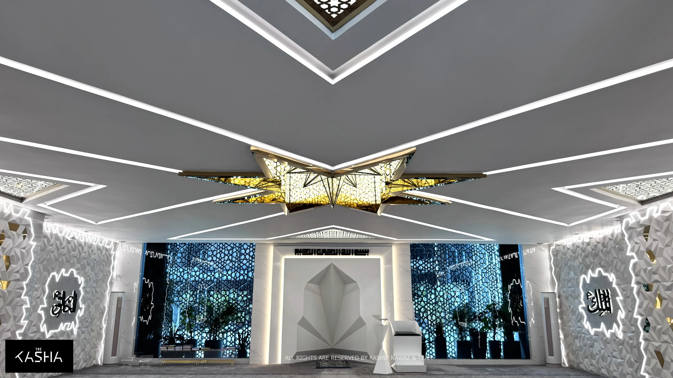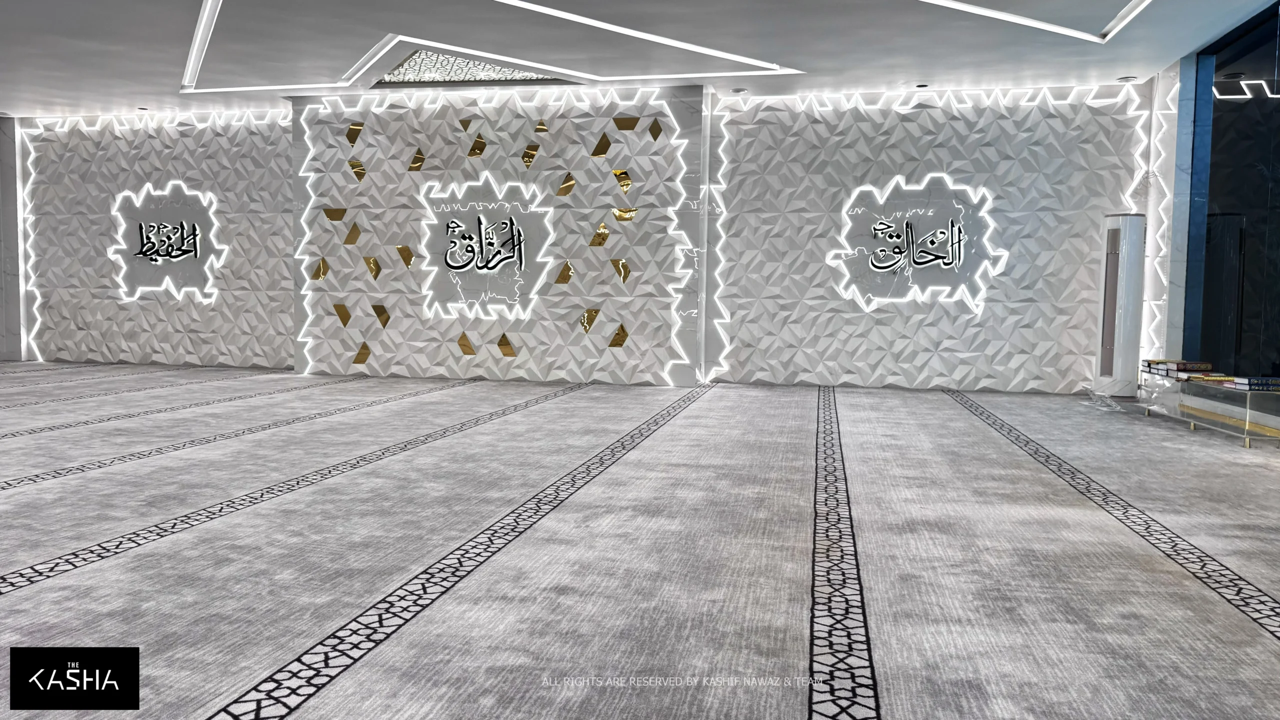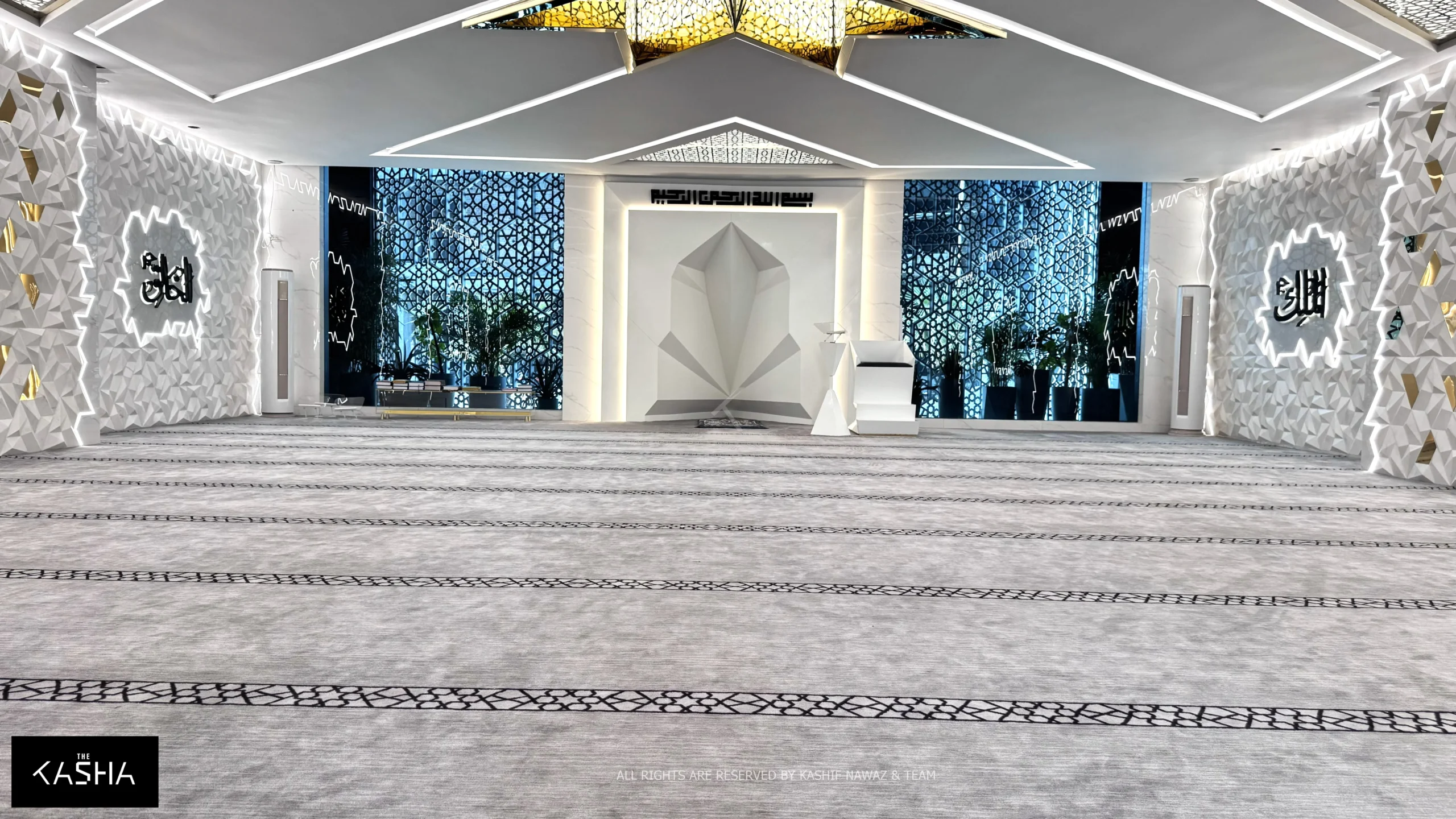 Inside the mosque, the design continues seamlessly. The interior ceiling features a prominent star-shaped element at the center, acting as a focal point and a source of illumination. The walls are finished with custom-designed 3D panels, adding depth, texture, and visual rhythm while maintaining a calm and minimal aesthetic.