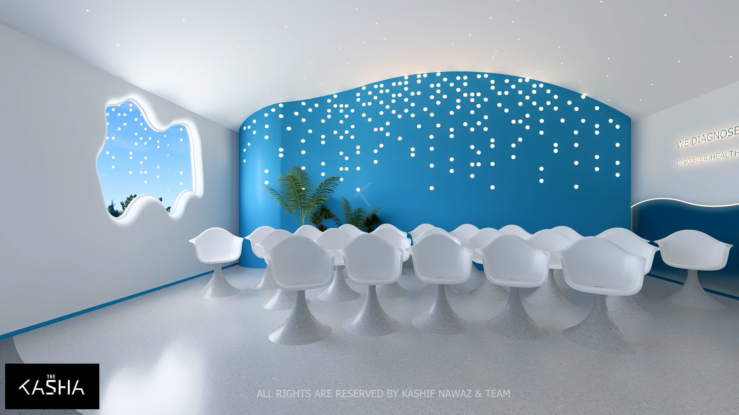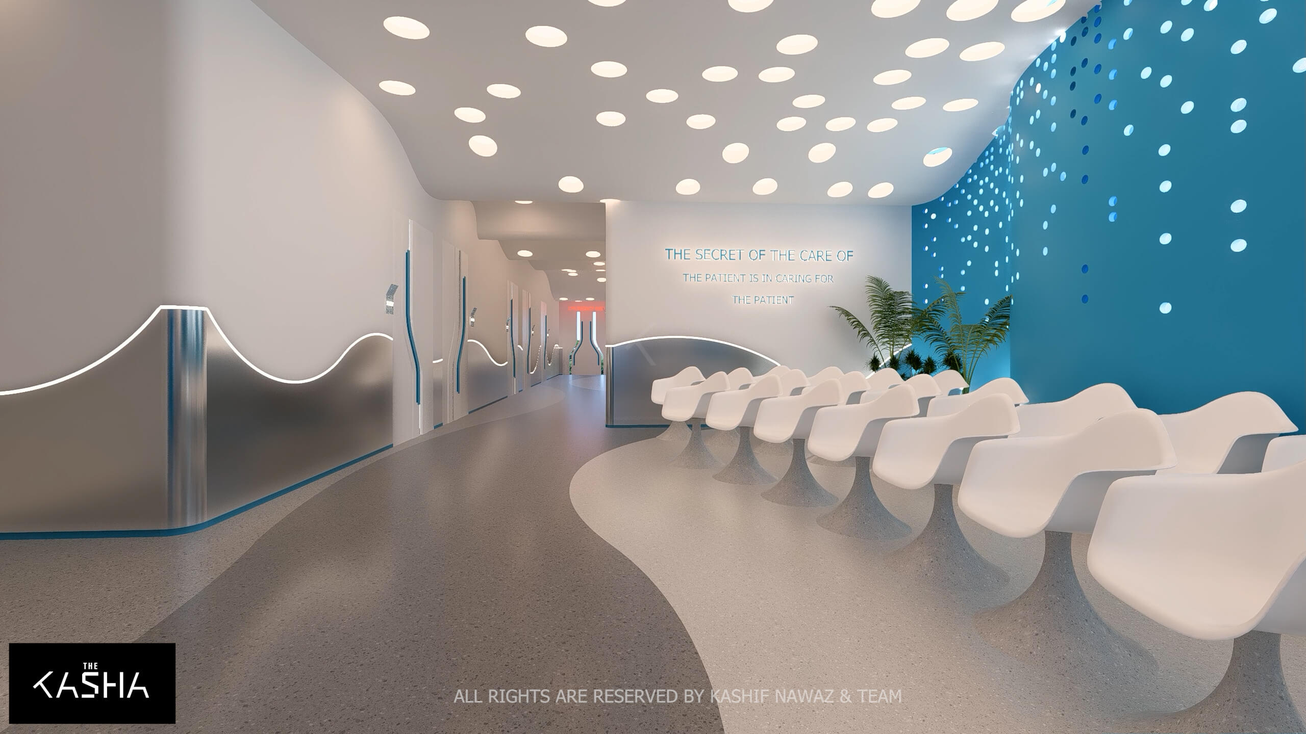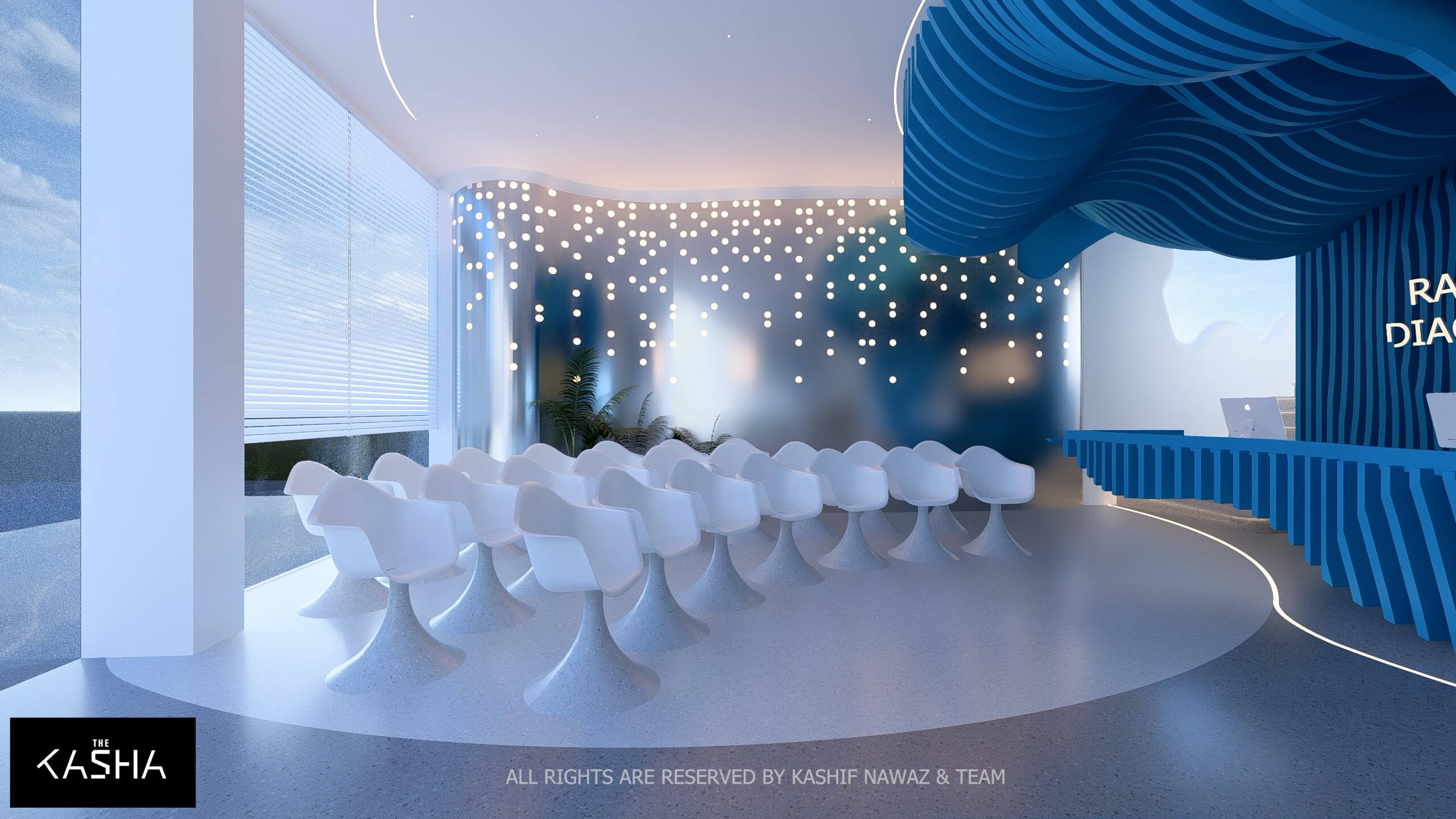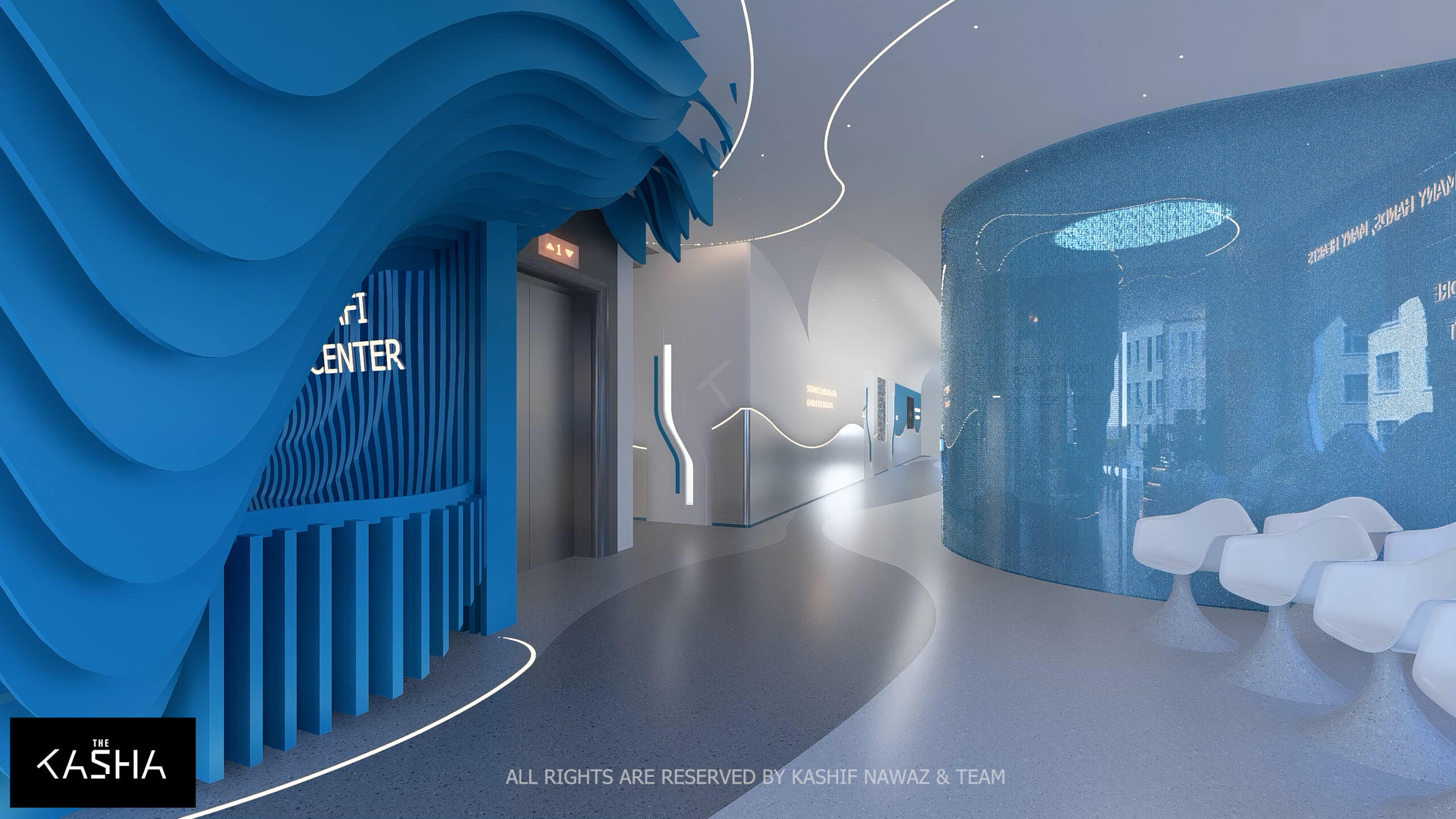 A visionary healthcare interior defined by fluid architectural forms, biophilic calmness, and futuristic minimalism. The space integrates sculptural blue parametric elements with seamless white surfaces to create a dynamic yet soothing environment. Curved circulation paths, perforated feature walls, and soft ambient lighting enhance spatial flow while promoting a sense of comfort and clarity. The design merges technology-driven workspaces with elegant waiting and consultation areas, delivering a patient-centered environment where innovation, efficiency, and contemporary aesthetics coexist in a refined medical setting.A visionary healthcare interior defined by fluid architectural forms, biophilic calmness, and futuristic minimalism. The space integrates sculptural blue parametric elements with seamless white surfaces to create a dynamic yet soothing environment. Curved circulation paths, perforated feature walls, and soft ambient lighting enhance spatial flow while promoting a sense of comfort and clarity. The design merges technology-driven workspaces with elegant waiting and consultation areas, delivering a patient-centered environment where innovation, efficiency, and contemporary aesthetics coexist in a refined medical setting.