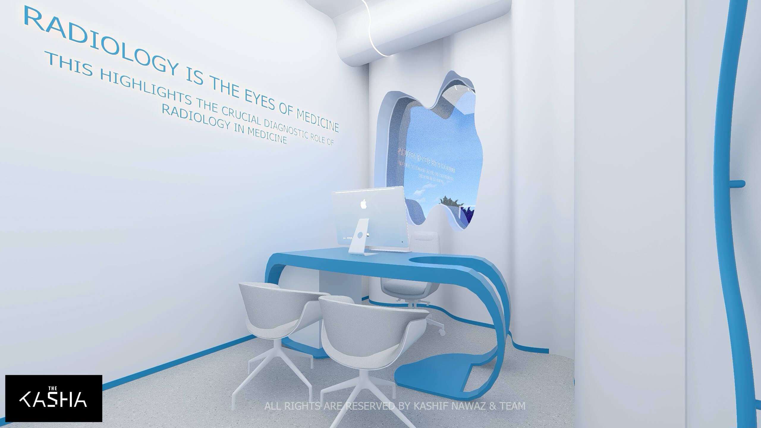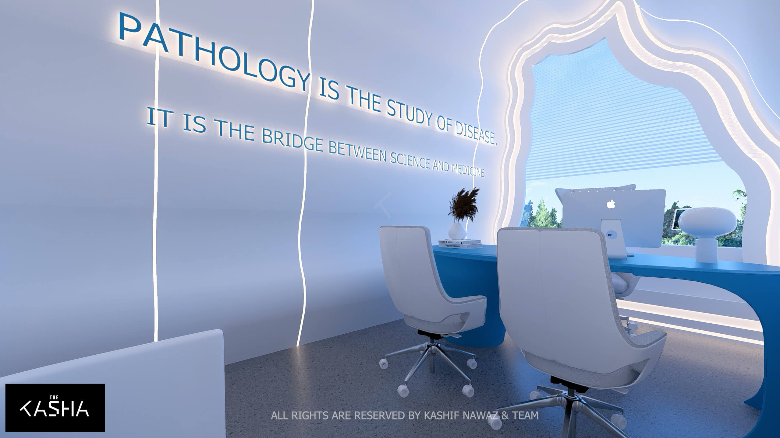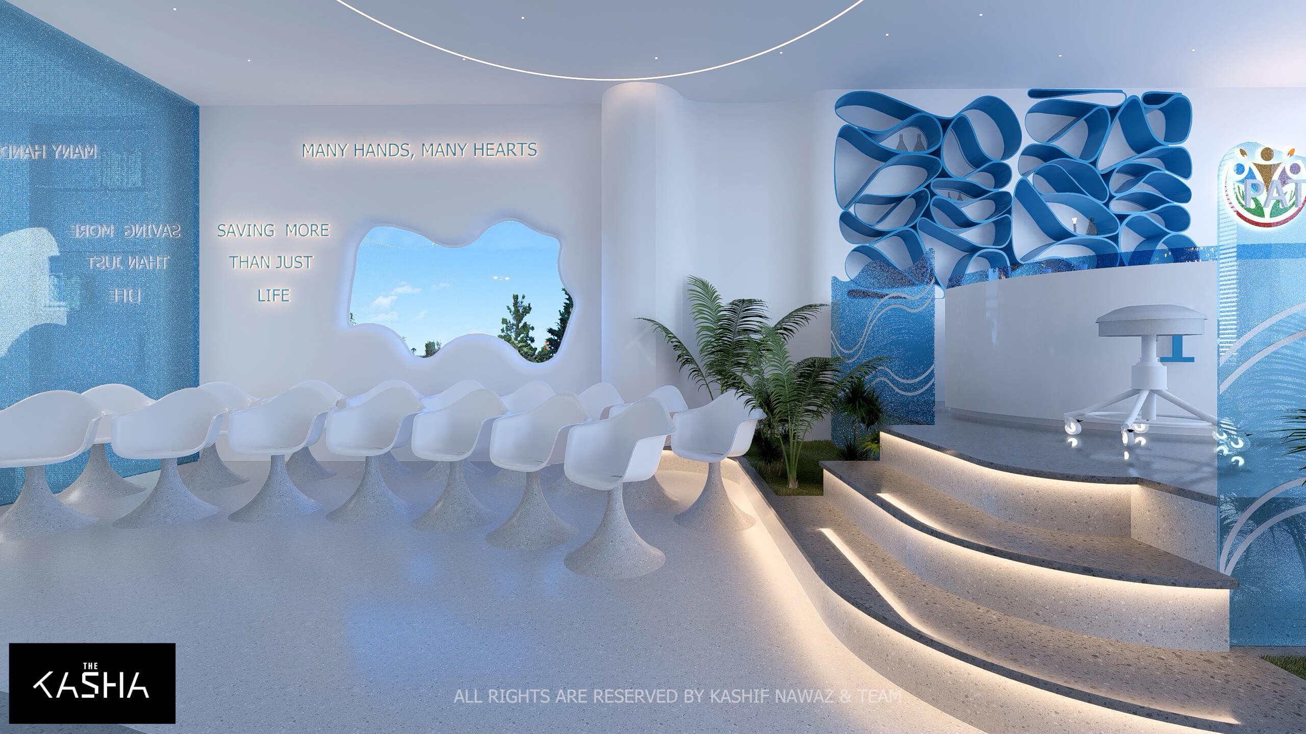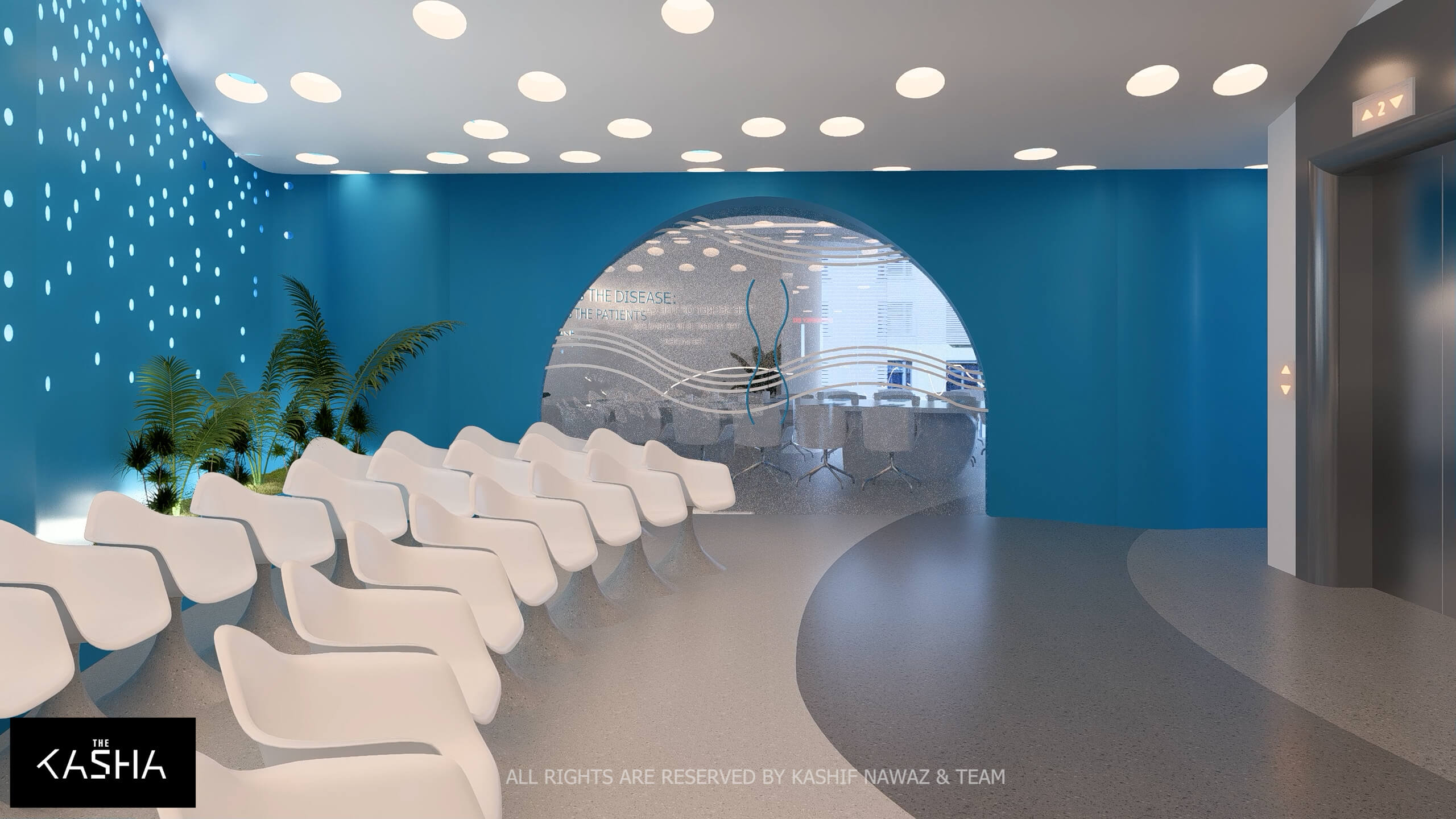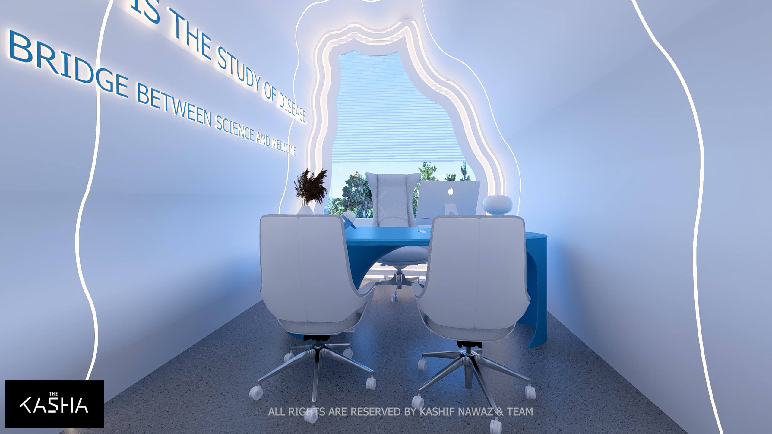 A visionary healthcare interior defined by fluid architectural forms, biophilic calmness, and futuristic minimalism. The space integrates sculptural blue parametric elements with seamless white surfaces to create a dynamic yet soothing environment. Curved circulation paths, perforated feature walls, and soft ambient lighting enhance spatial flow while promoting a sense of comfort and clarity. The design merges technology-driven workspaces with elegant waiting and consultation areas, delivering a patient-centered environment where innovation, efficiency, and contemporary aesthetics coexist in a refined medical setting.A visionary healthcare interior defined by fluid architectural forms, biophilic calmness, and futuristic minimalism. The space integrates sculptural blue parametric elements with seamless white surfaces to create a dynamic yet soothing environment. Curved circulation paths, perforated feature walls, and soft ambient lighting enhance spatial flow while promoting a sense of comfort and clarity. The design merges technology-driven workspaces with elegant waiting and consultation areas, delivering a patient-centered environment where innovation, efficiency, and contemporary aesthetics coexist in a refined medical setting.