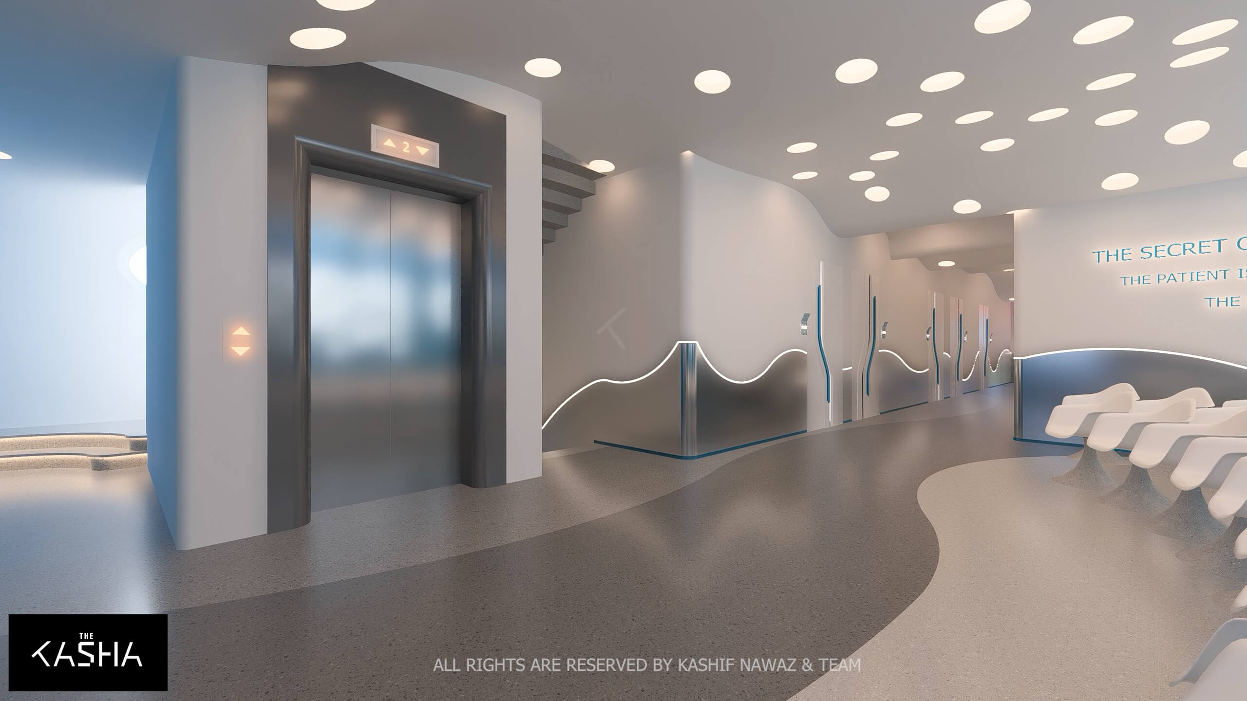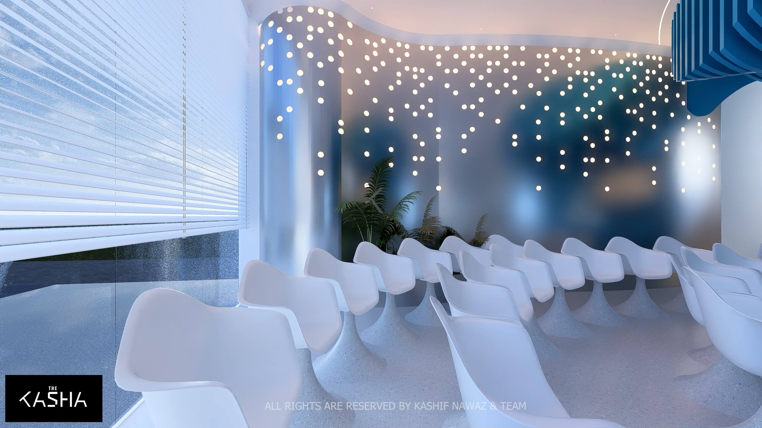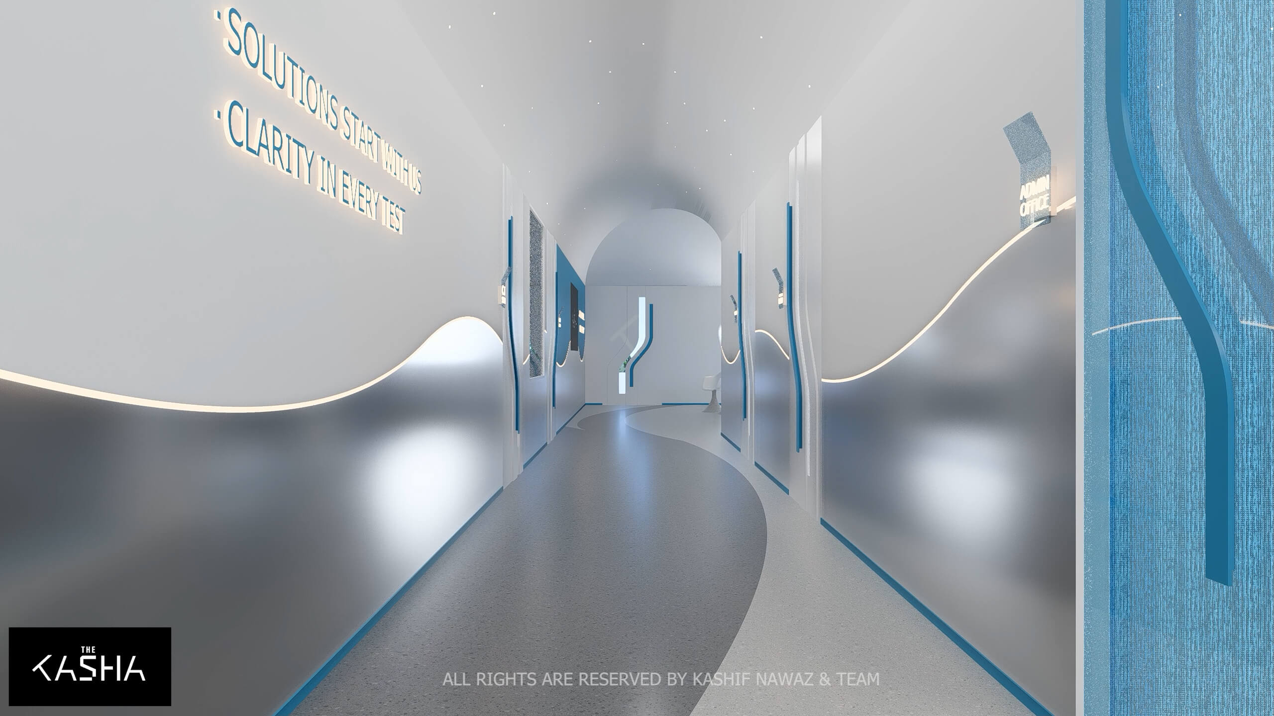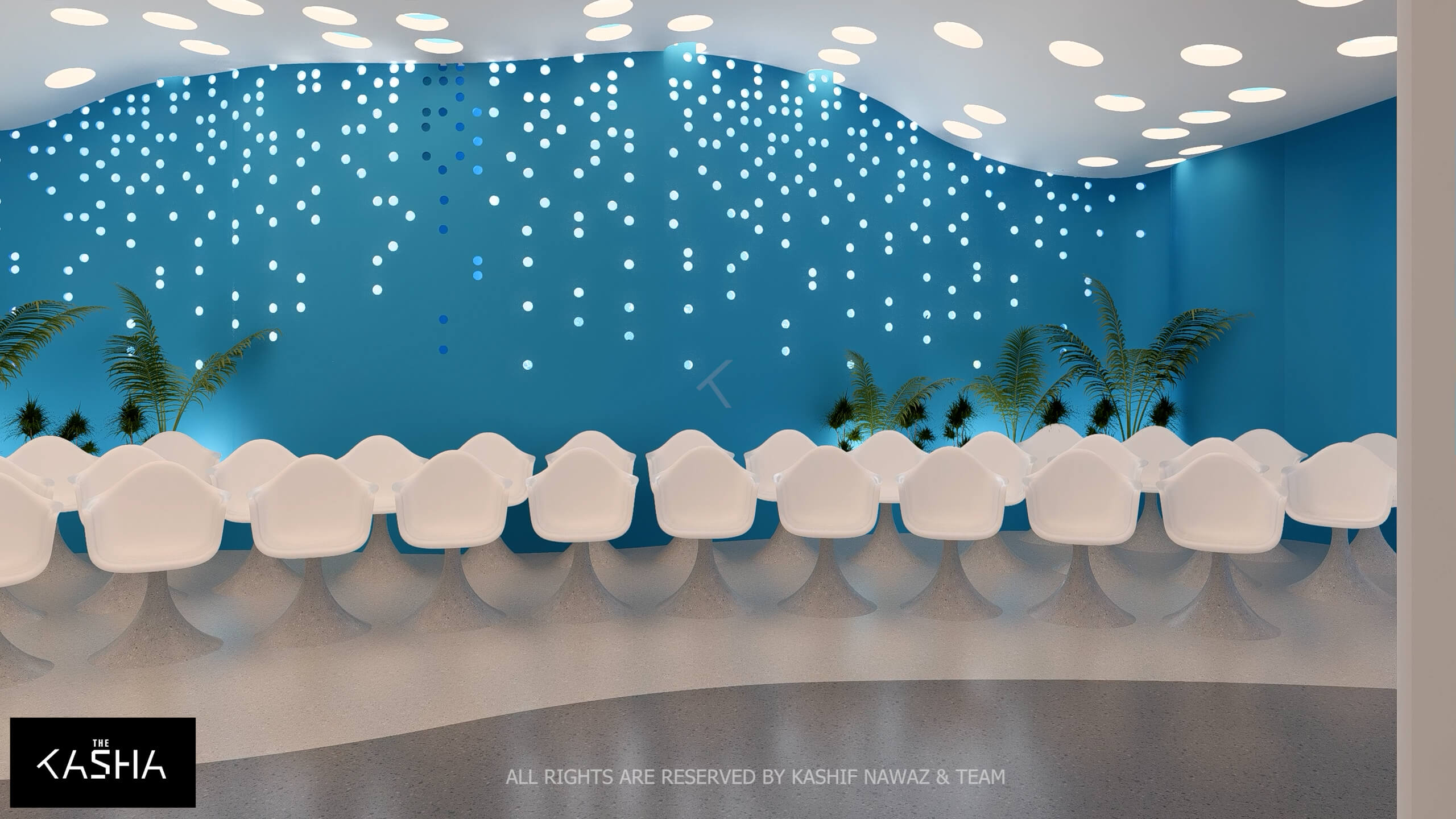 A visionary healthcare interior defined by fluid architectural forms, biophilic calmness, and futuristic minimalism. The space integrates sculptural blue parametric elements with seamless white surfaces to create a dynamic yet soothing environment. Curved circulation paths, perforated feature walls, and soft ambient lighting enhance spatial flow while promoting a sense of comfort and clarity. The design merges technology-driven workspaces with elegant waiting and consultation areas, delivering a patient-centered environment where innovation, efficiency, and contemporary aesthetics coexist in a refined medical setting.A visionary healthcare interior defined by fluid architectural forms, biophilic calmness, and futuristic minimalism. The space integrates sculptural blue parametric elements with seamless white surfaces to create a dynamic yet soothing environment. Curved circulation paths, perforated feature walls, and soft ambient lighting enhance spatial flow while promoting a sense of comfort and clarity. The design merges technology-driven workspaces with elegant waiting and consultation areas, delivering a patient-centered environment where innovation, efficiency, and contemporary aesthetics coexist in a refined medical setting.