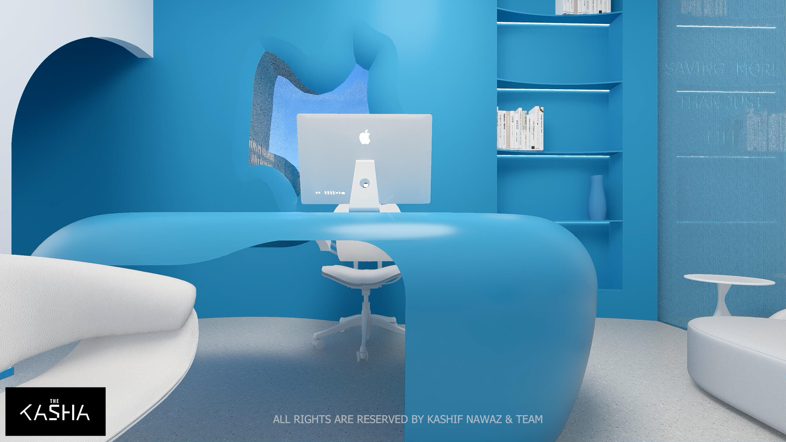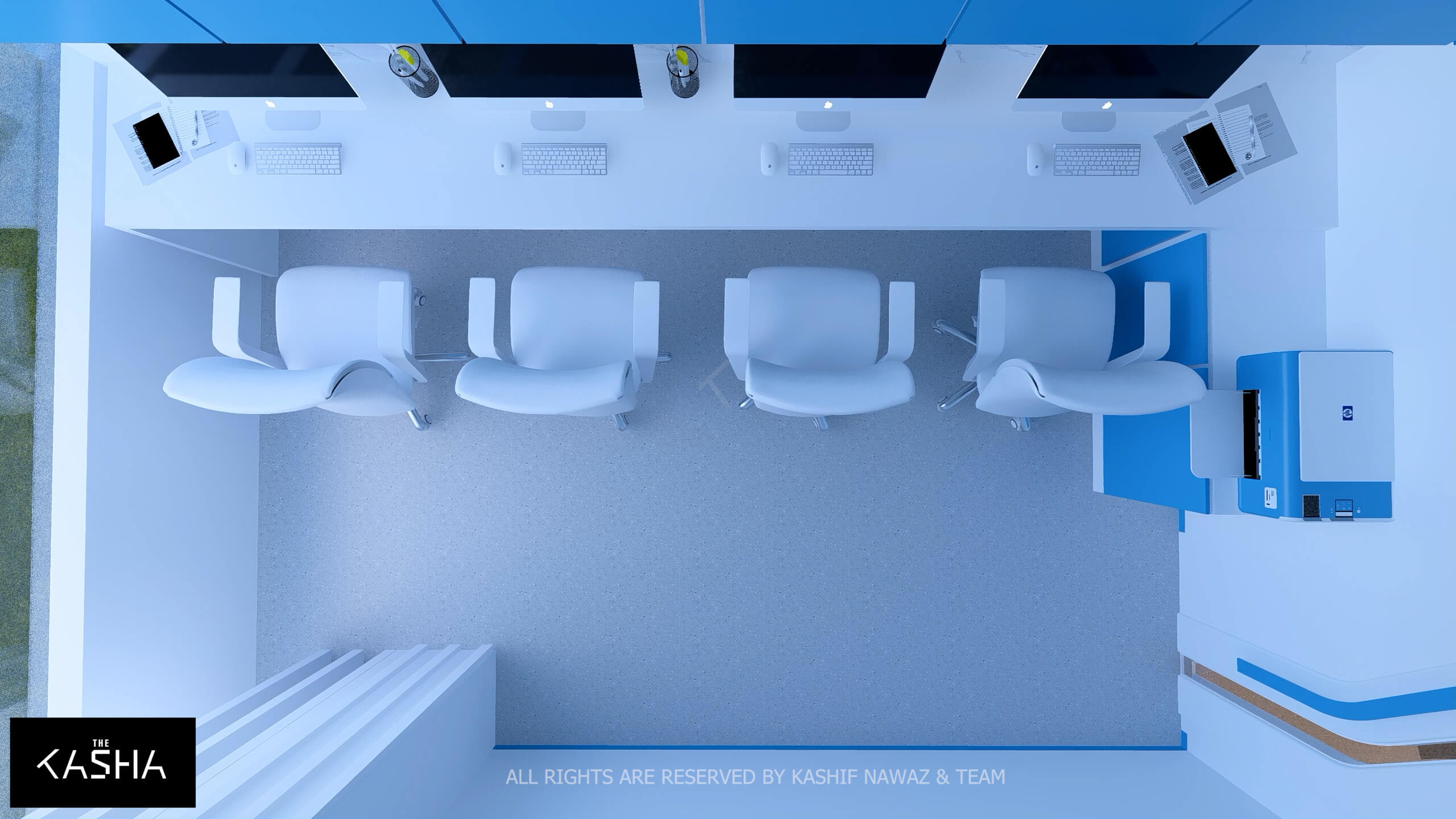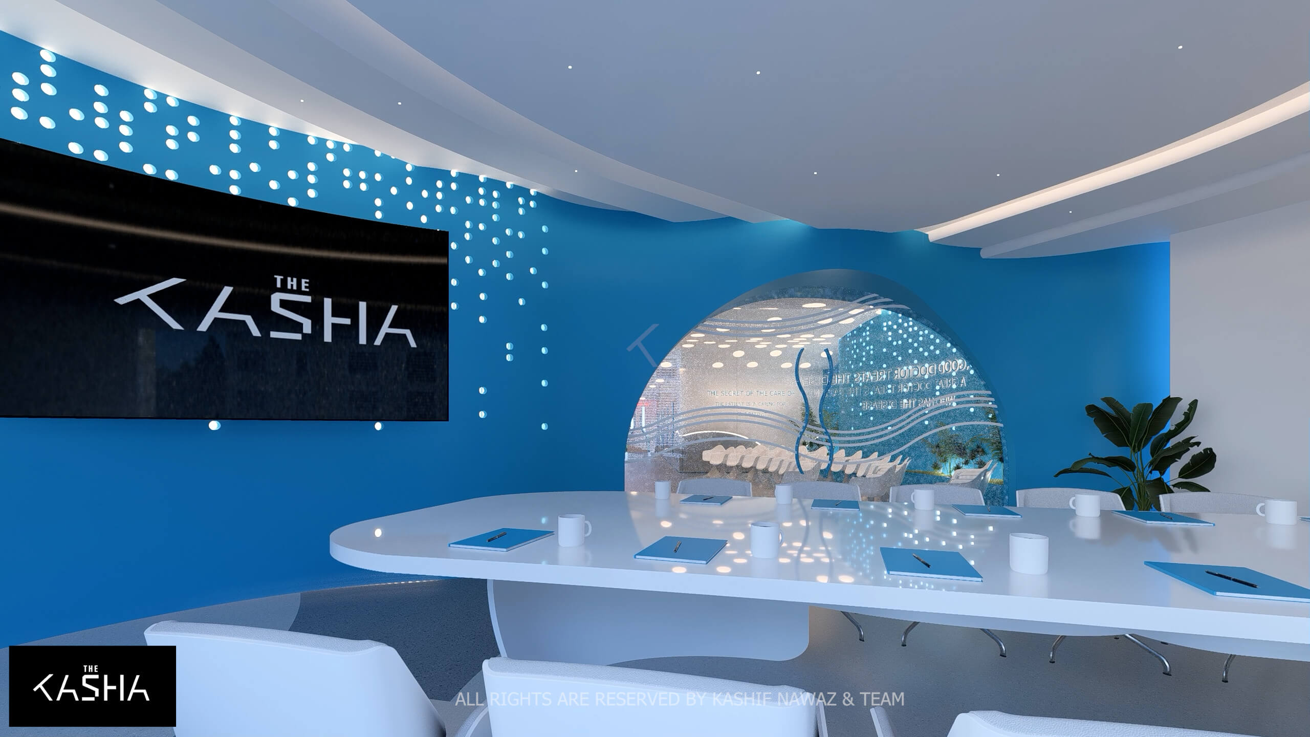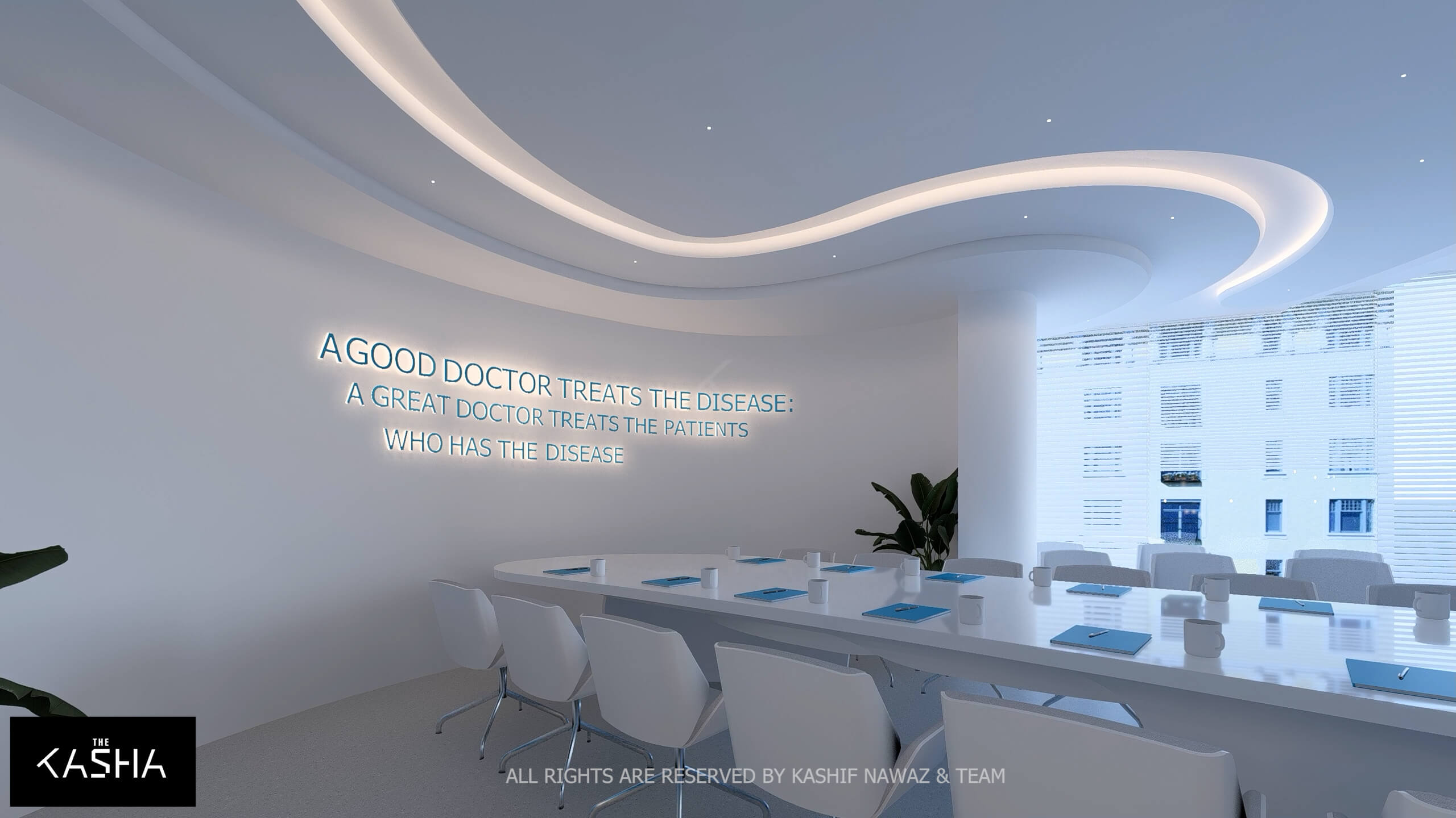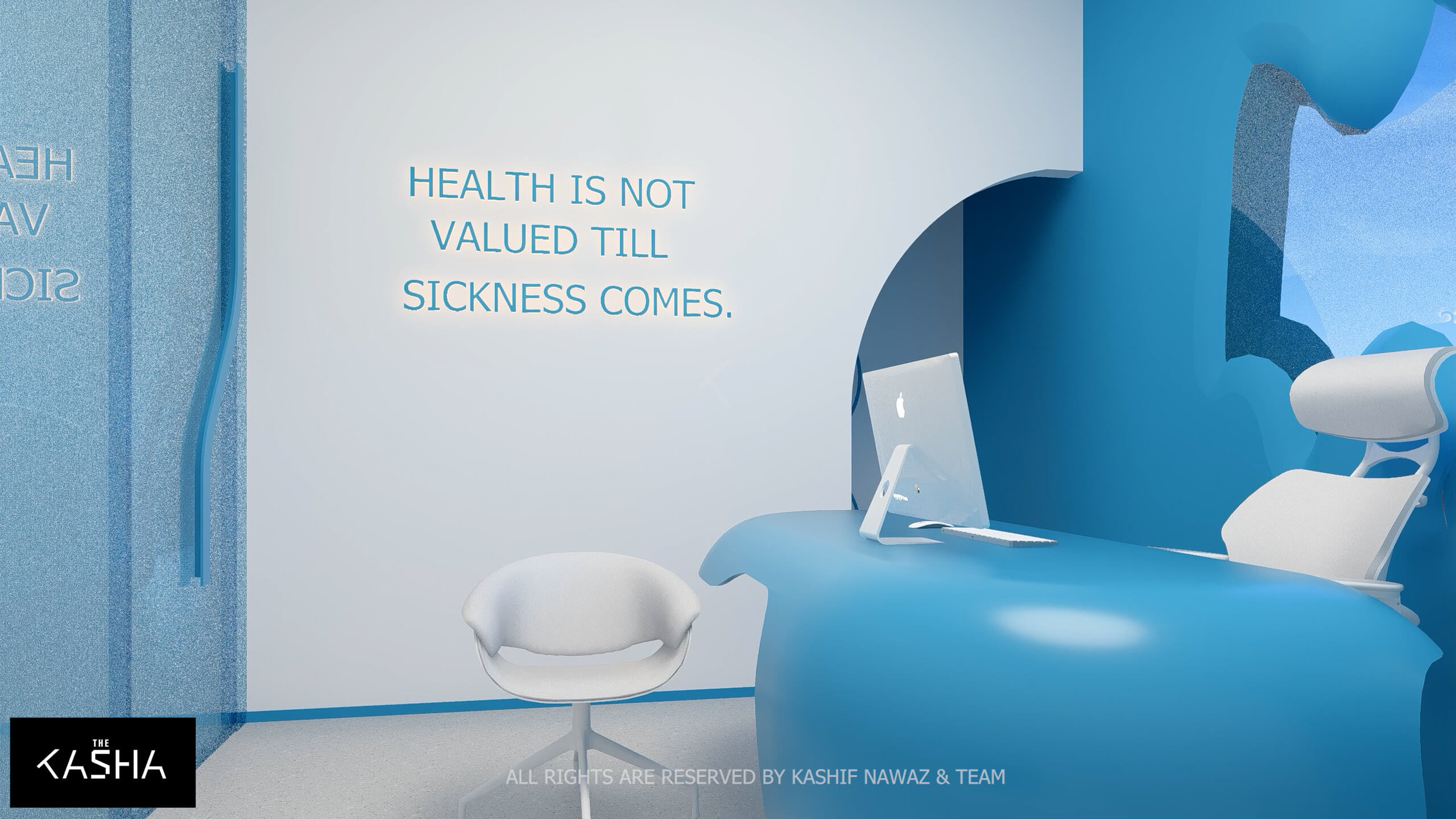 A visionary healthcare interior defined by fluid architectural forms, biophilic calmness, and futuristic minimalism. The space integrates sculptural blue parametric elements with seamless white surfaces to create a dynamic yet soothing environment. Curved circulation paths, perforated feature walls, and soft ambient lighting enhance spatial flow while promoting a sense of comfort and clarity. The design merges technology-driven workspaces with elegant waiting and consultation areas, delivering a patient-centered environment where innovation, efficiency, and contemporary aesthetics coexist in a refined medical setting.A visionary healthcare interior defined by fluid architectural forms, biophilic calmness, and futuristic minimalism. The space integrates sculptural blue parametric elements with seamless white surfaces to create a dynamic yet soothing environment. Curved circulation paths, perforated feature walls, and soft ambient lighting enhance spatial flow while promoting a sense of comfort and clarity. The design merges technology-driven workspaces with elegant waiting and consultation areas, delivering a patient-centered environment where innovation, efficiency, and contemporary aesthetics coexist in a refined medical setting.