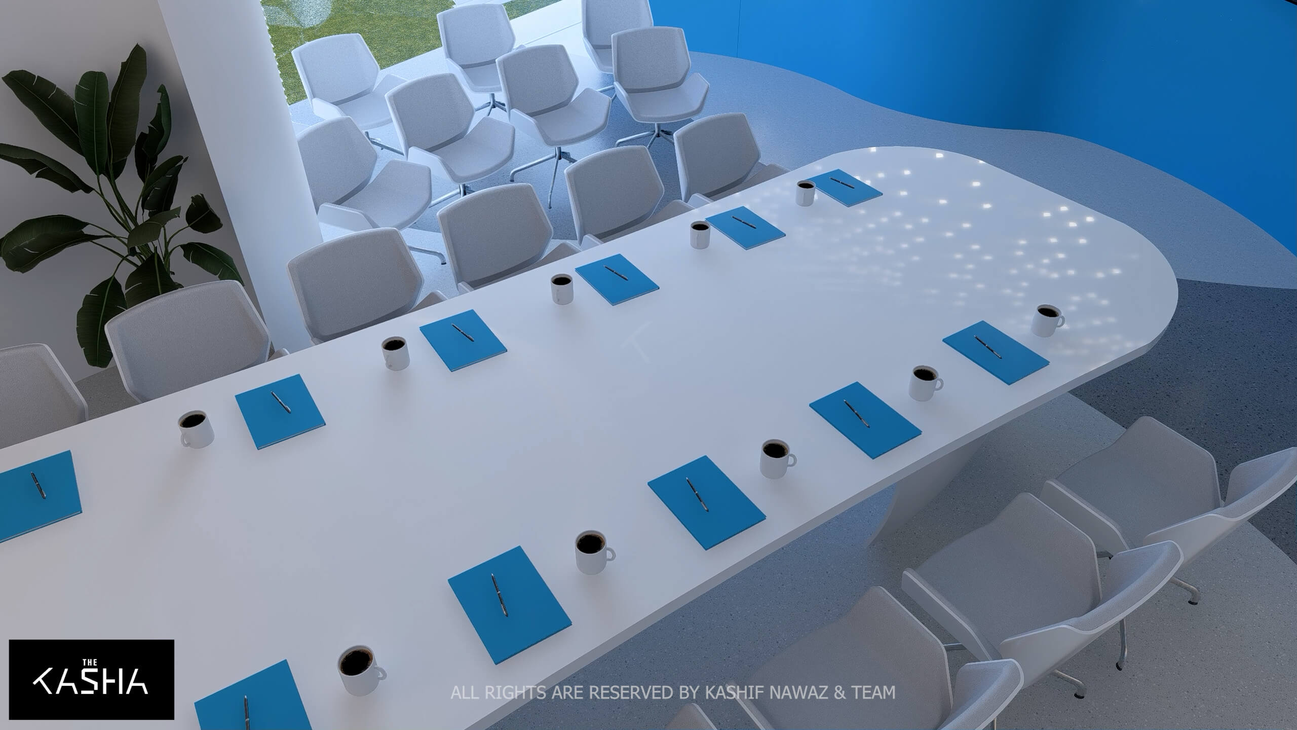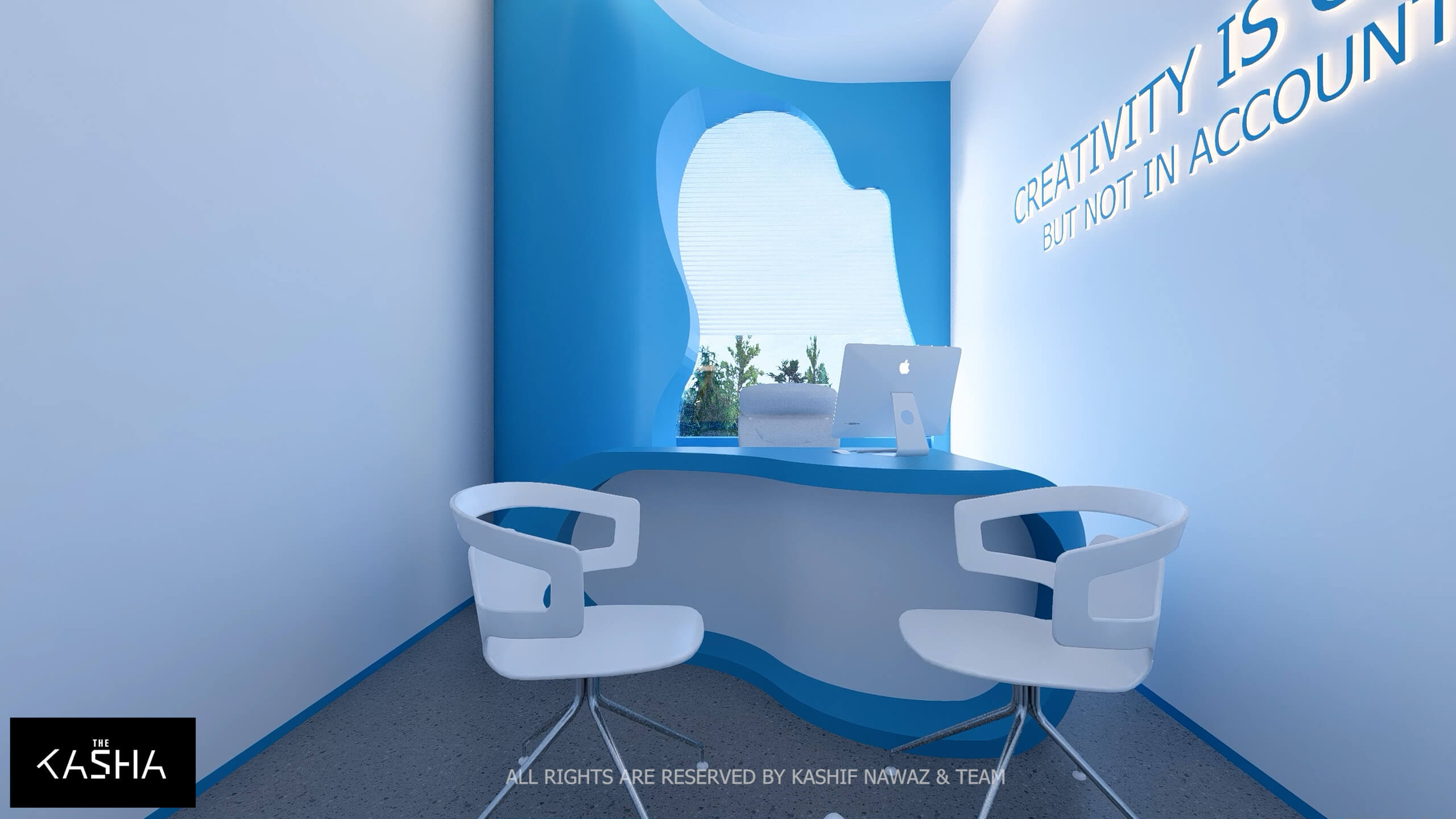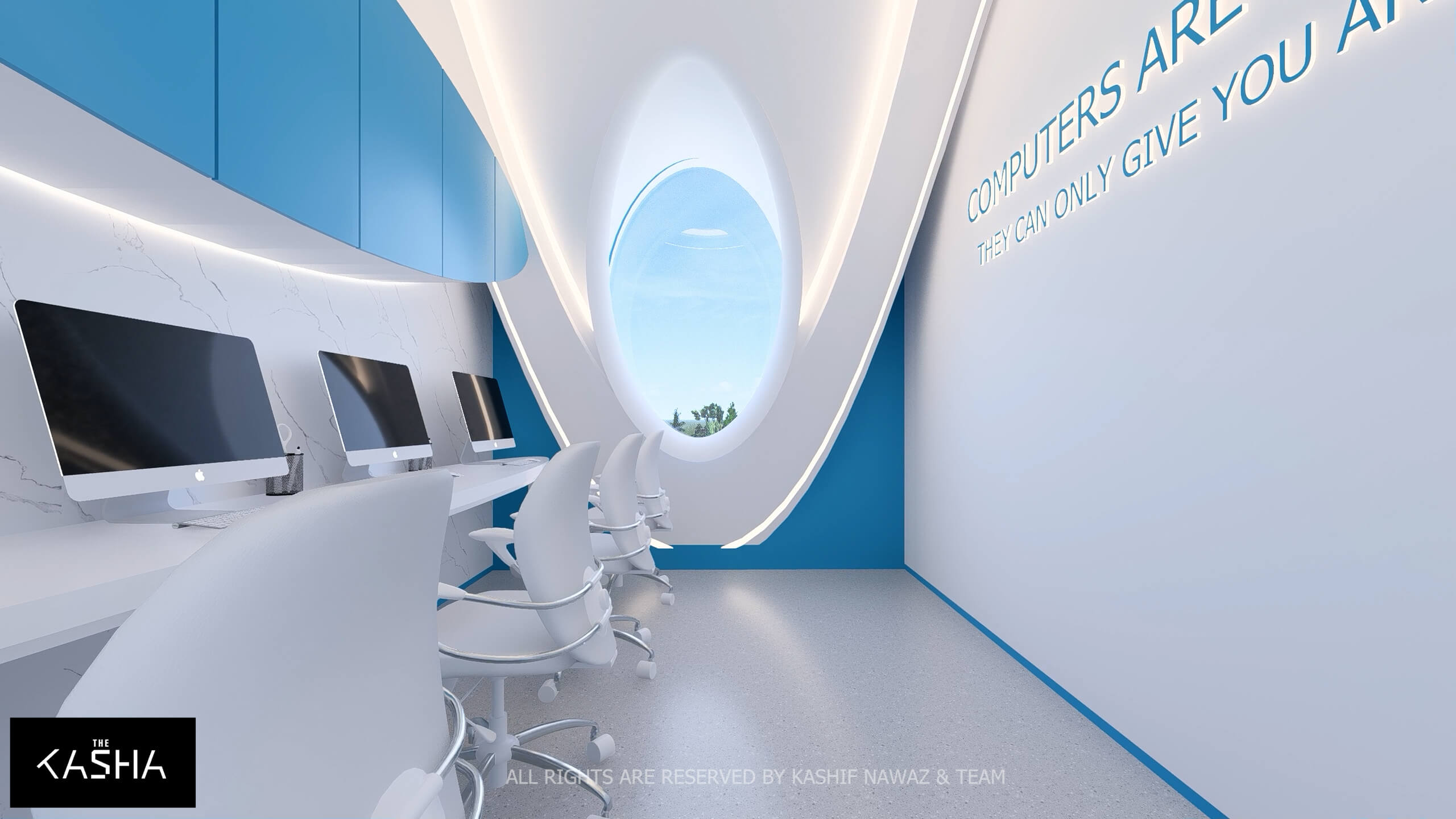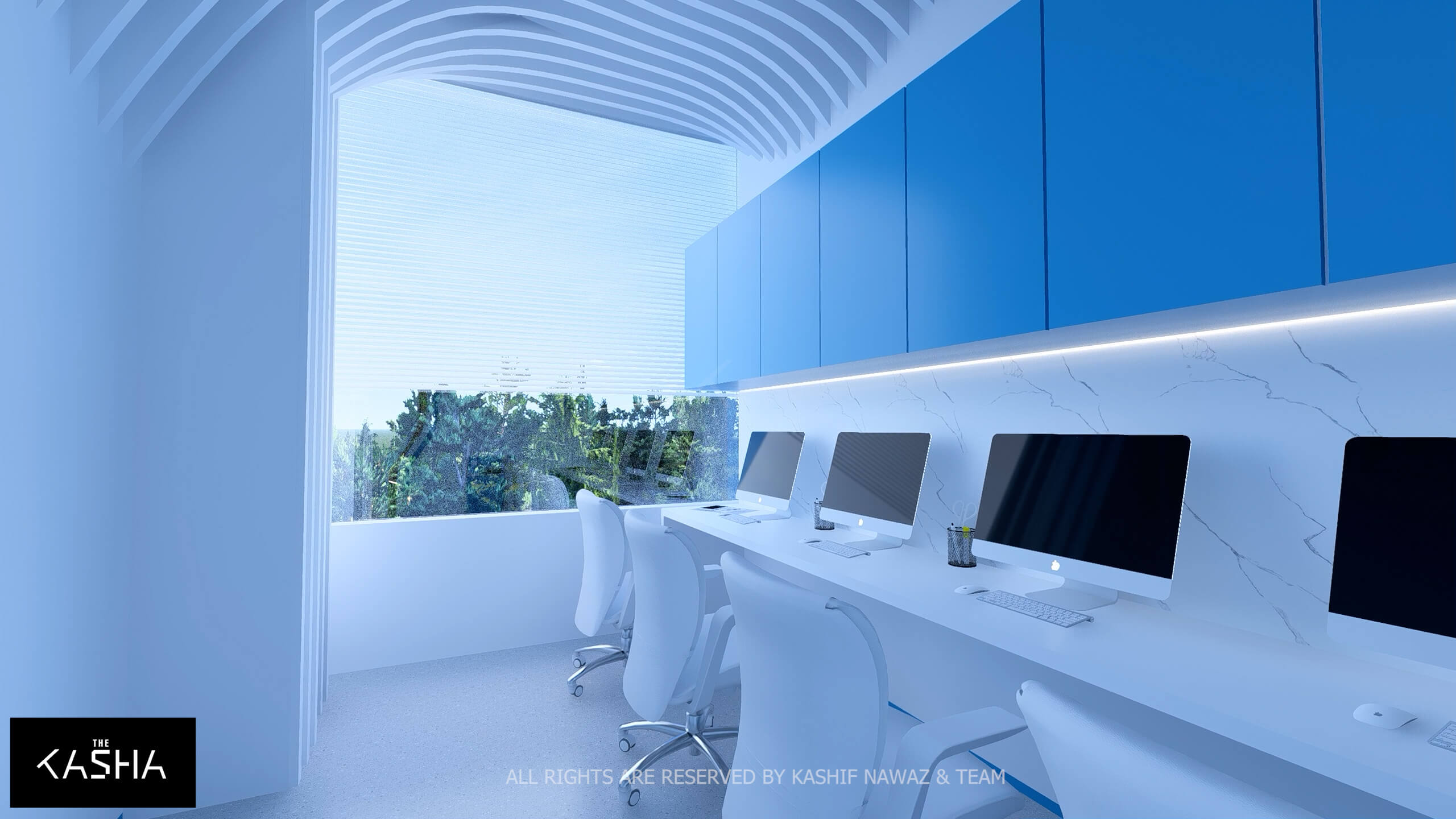 A visionary healthcare interior defined by fluid architectural forms, biophilic calmness, and futuristic minimalism. The space integrates sculptural blue parametric elements with seamless white surfaces to create a dynamic yet soothing environment. Curved circulation paths, perforated feature walls, and soft ambient lighting enhance spatial flow while promoting a sense of comfort and clarity. The design merges technology-driven workspaces with elegant waiting and consultation areas, delivering a patient-centered environment where innovation, efficiency, and contemporary aesthetics coexist in a refined medical setting.A visionary healthcare interior defined by fluid architectural forms, biophilic calmness, and futuristic minimalism. The space integrates sculptural blue parametric elements with seamless white surfaces to create a dynamic yet soothing environment. Curved circulation paths, perforated feature walls, and soft ambient lighting enhance spatial flow while promoting a sense of comfort and clarity. The design merges technology-driven workspaces with elegant waiting and consultation areas, delivering a patient-centered environment where innovation, efficiency, and contemporary aesthetics coexist in a refined medical setting.
