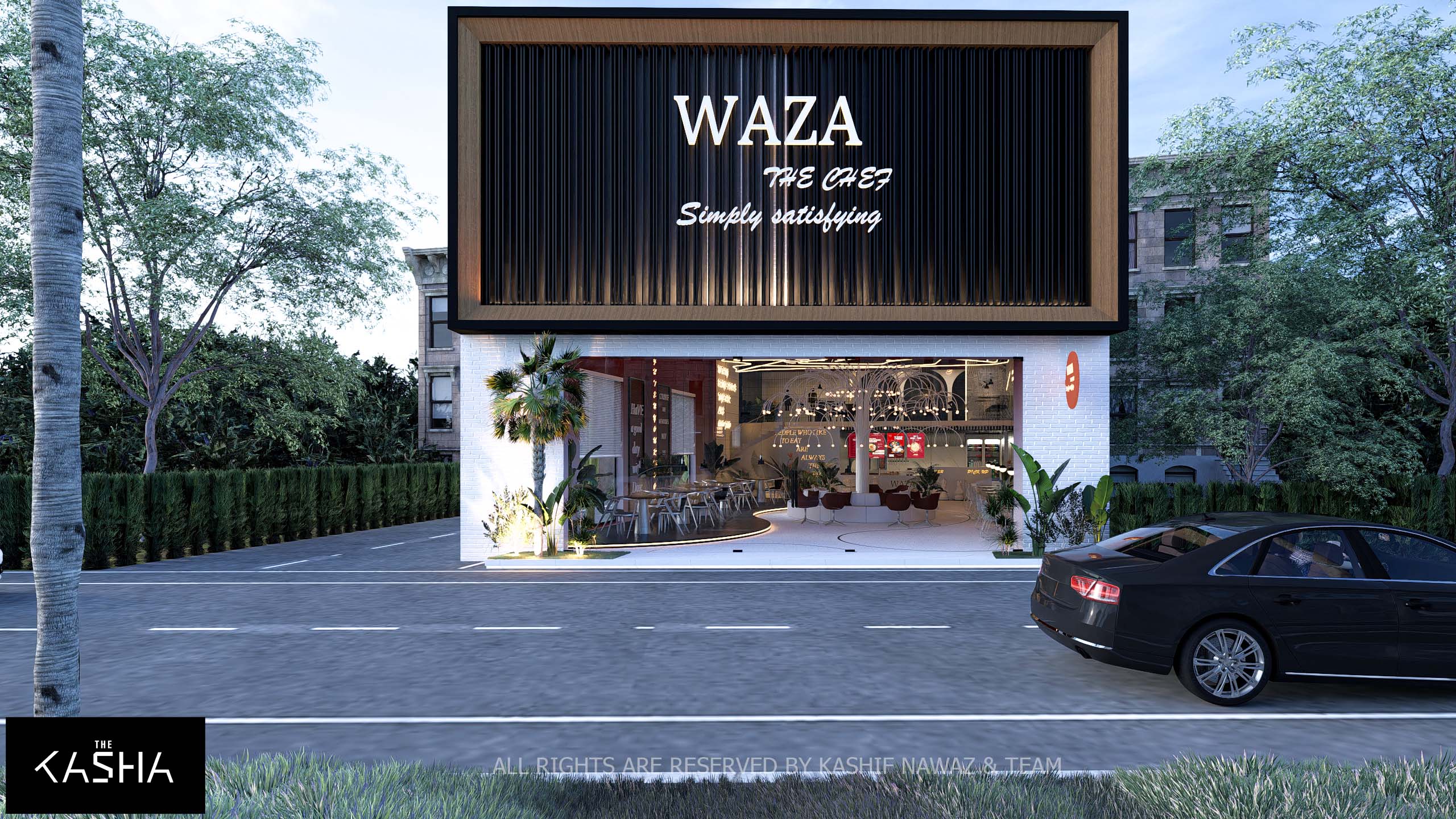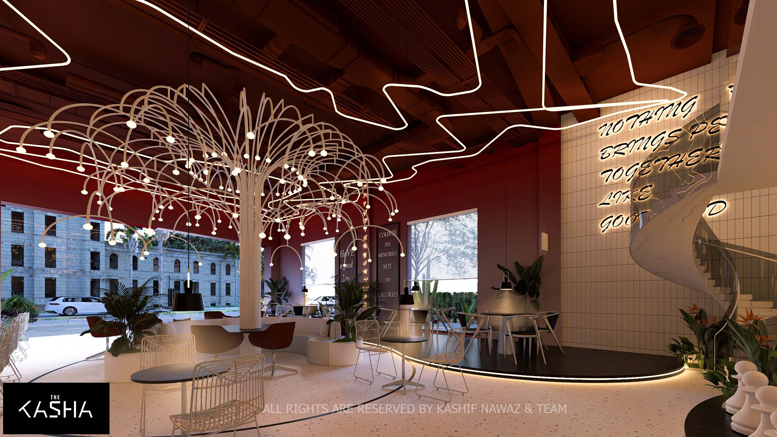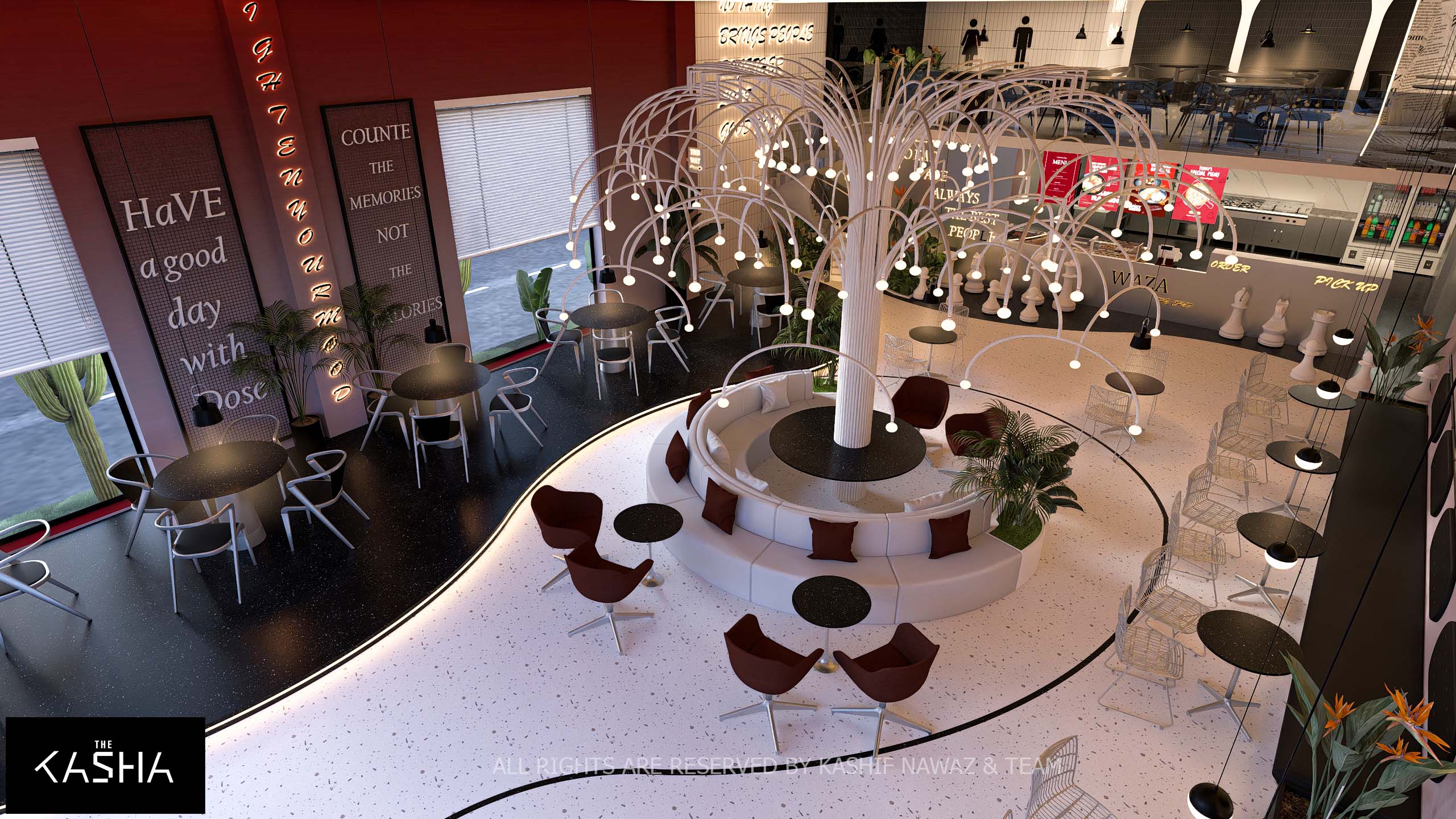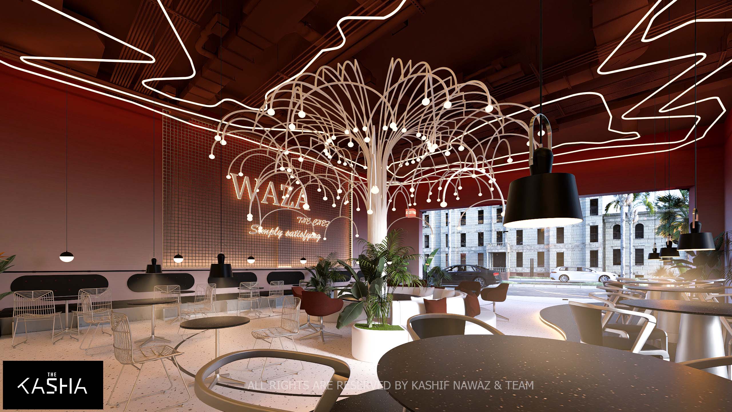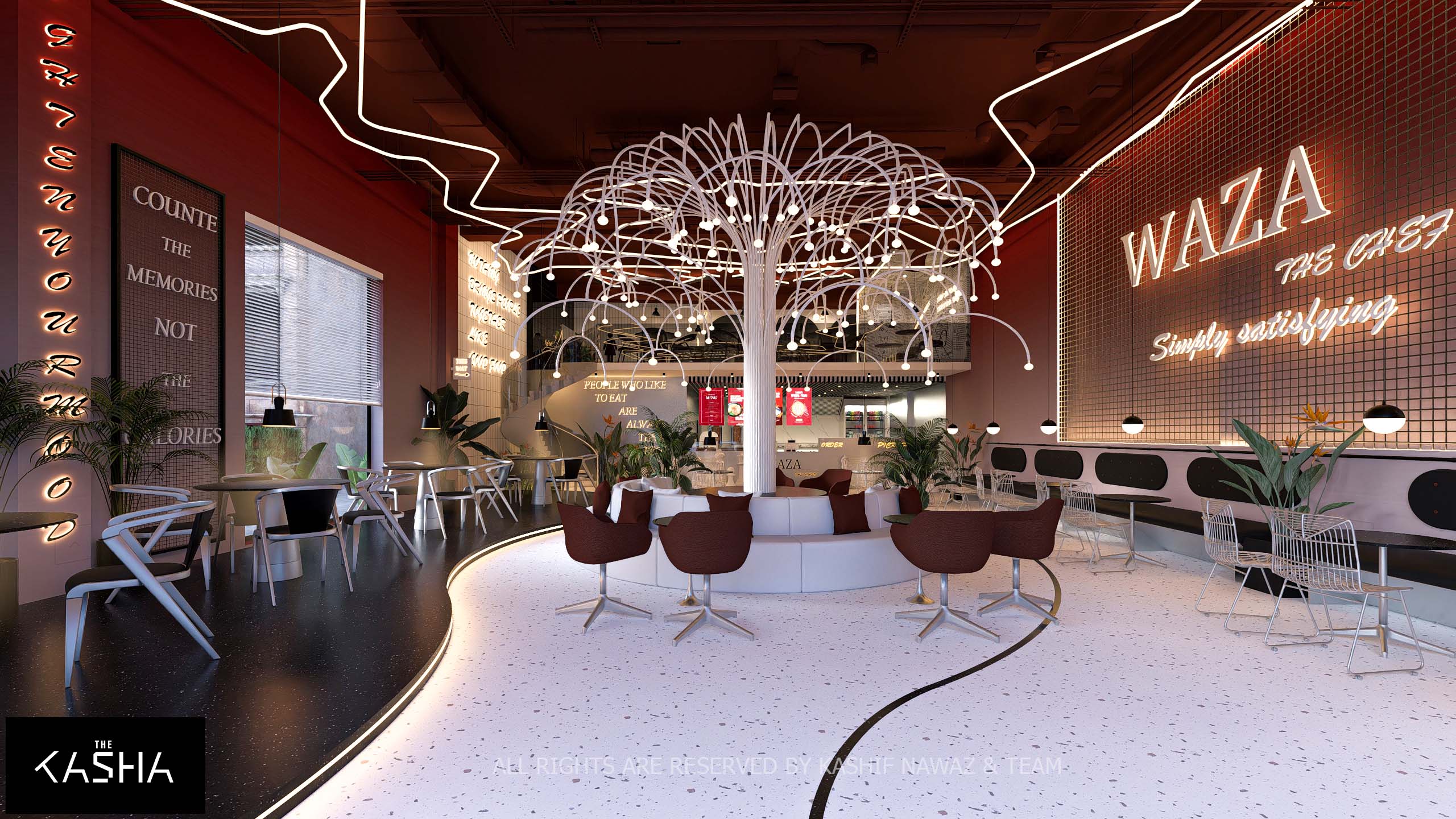The design for Waza presents a bold, industrial-chic aesthetic that utilizes a high-contrast palette of black, white, and deep terracotta red to create a vibrant urban atmosphere. The exterior is defined by a massive, dark slatted rectangular volume that serves as a dramatic covering over a transparent, white-brick ground floor, offering a seamless visual transition . Inside, the space is anchored by a stunning white sculptural “tree” light fixture that fans out over a circular central lounge, serving as a whimsical focal point that breaks the rigid geometry of the room. Dynamic terrazzo flooring in contrasting light and dark tones further delineates the different seating zones, while floor-to-ceiling typography and neon signage add a playful, modern energy to the vertical surfaces.