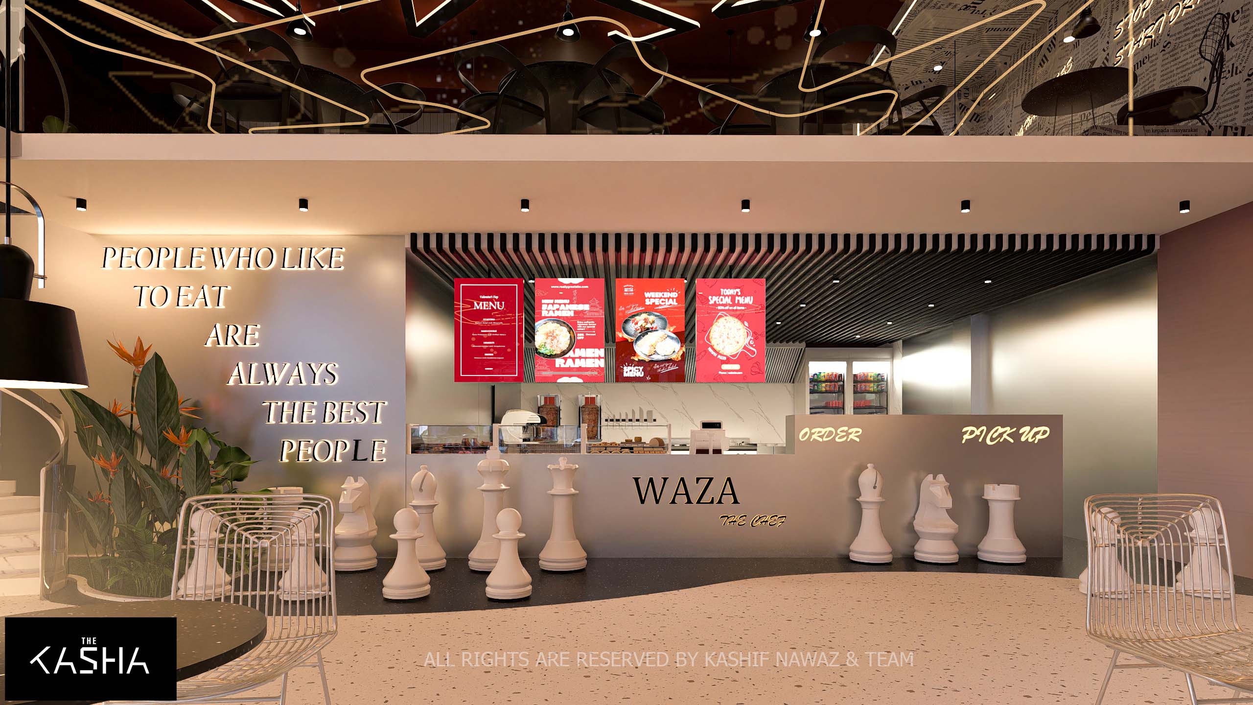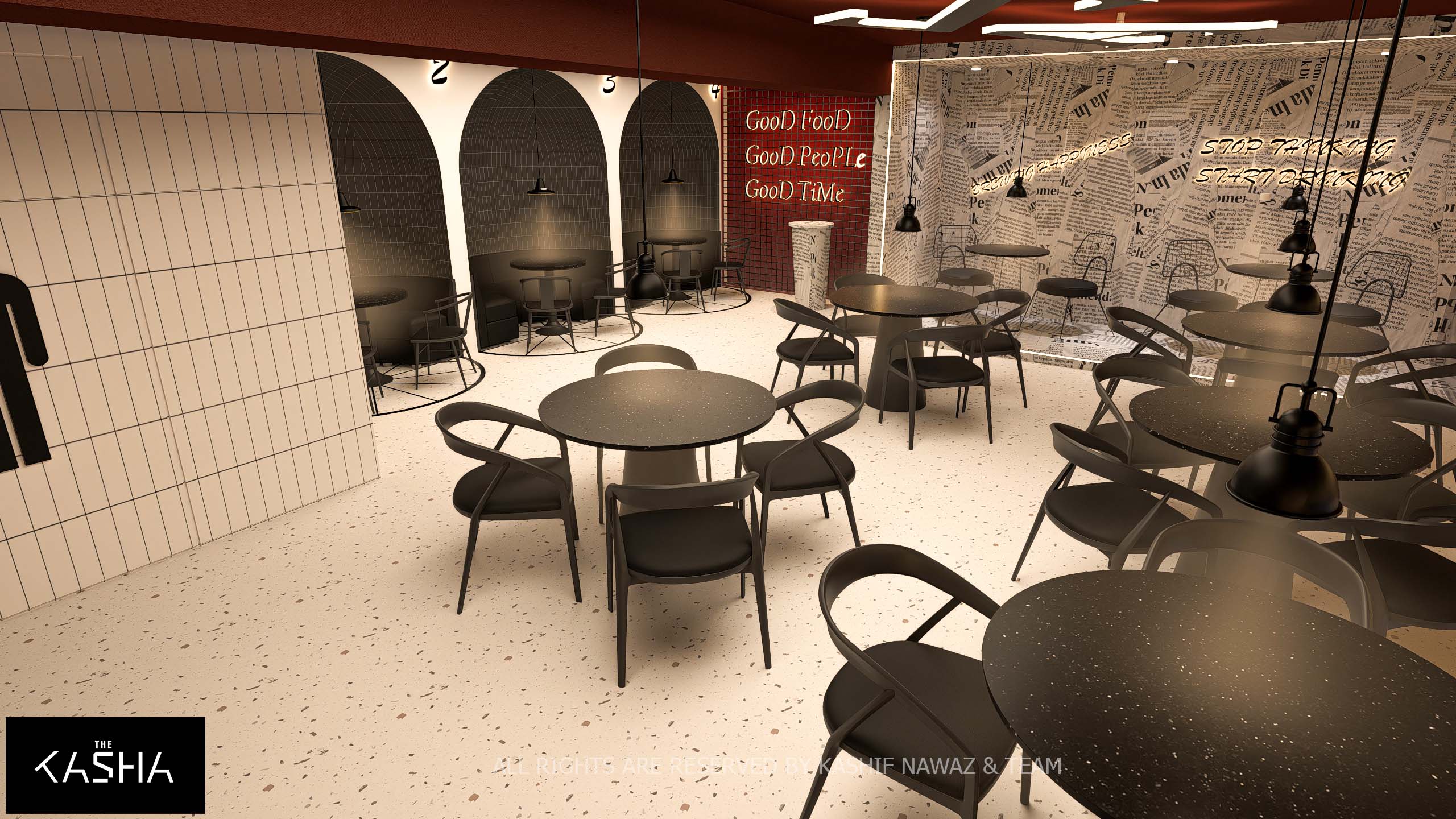 Functionality and artistic storytelling are integrated through clever material choices and thematic decor elements. One wing of the dining area features walls clad in monochromatic newsprint wallpaper accented by glowing motivational quotes, providing a textured, conversational backdrop for the minimalist black furniture. Large arched alcoves with dark tiled backdrops offer more intimate, semi-private booth seating, while chess-piece inspired pedestals at the service counter add a sophisticated, strategic design touch. The lighting is meticulously layered, utilizing industrial pendant lamps for task lighting and soft perimeter LEDs to highlight the architectural curves, resulting in a space that feels both edgy and inviting.